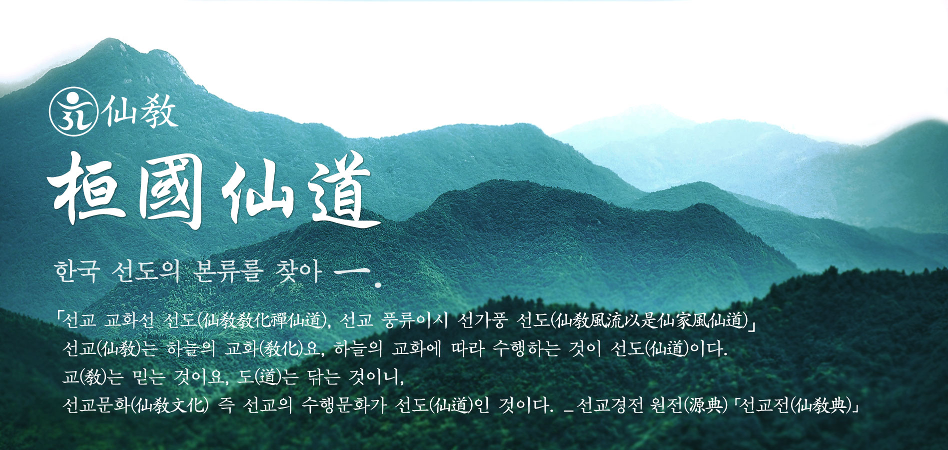 선교 교화선 선도(仙敎敎化禪仙道), 선교 풍류이시 선가풍 선도(仙敎風流以是仙家風仙道). 선교(仙敎)는 하늘의 교화(敎化)요, 하늘의 교화에 따라 수행하는 것이 선도(仙道)이다. 교(敎)는 믿는 것이요, 도(道)는 닦는 것이니, 선교문화(仙敎文化) 일반(一般) 즉 선교의 수행문화가 선도(仙道)인 것이다. _ 선교경전 원전(源典) 「선교전(仙敎典)」