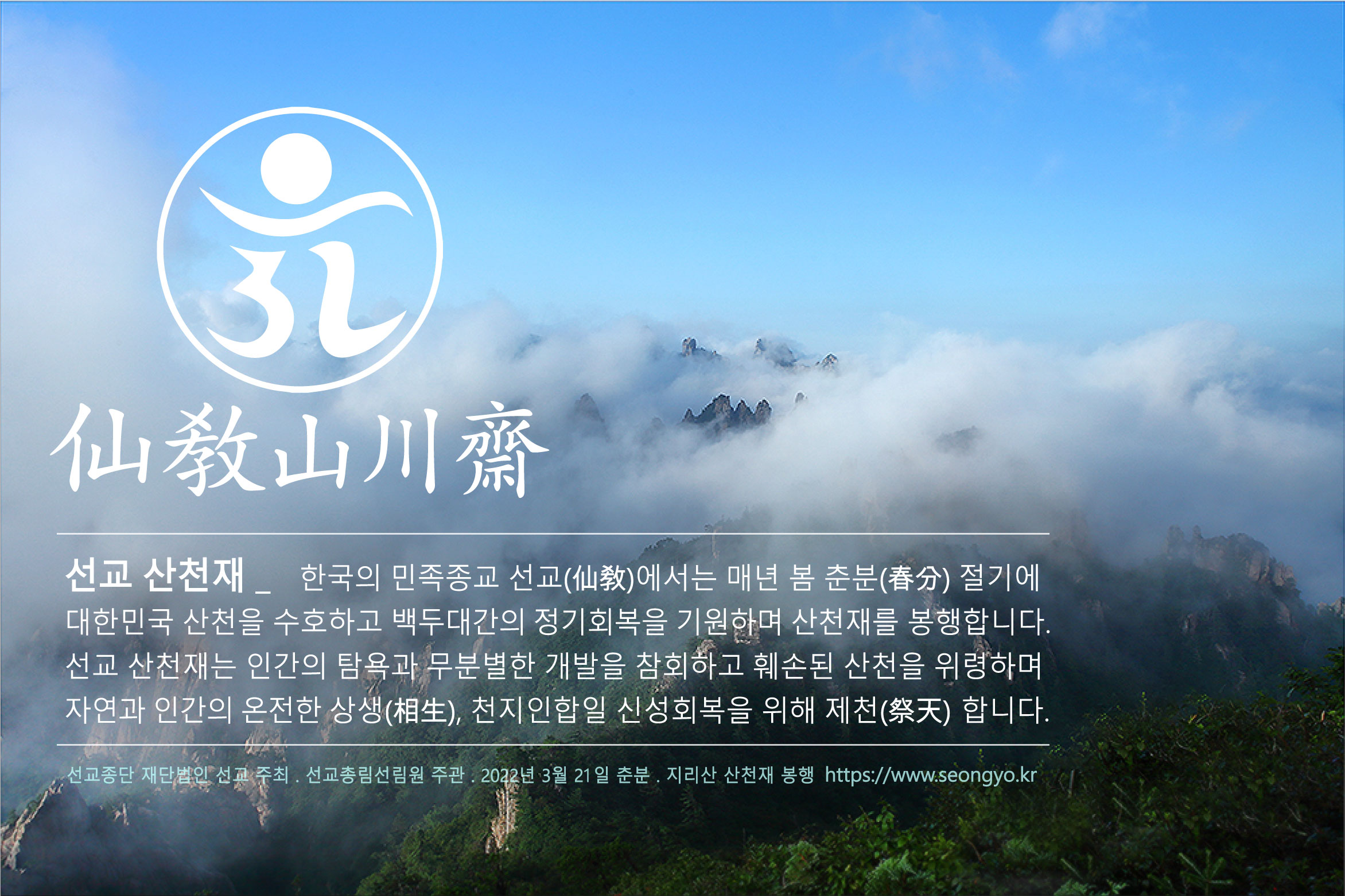 [선교 산천재] 2001년 지리산 노고단에서 시작하여 2022년에 이르기까지 "백두대간의 정기회복과 4대강 생명력 부활"을 기원하고 있습니다. 대한민국 백두대간의 곳곳은 무분별한 개발과 몰지각한 환경의식으로 훼손된 곳이 많습니다. 산맥 전체가 깎여나가고 죽어가고 있는 곳, 심각하게 오염된 4대강, 처참하게 훼손되어진 대한민국 산천 곳곳의 고통을 이제 우리가 위로하고 지극한 정성으로 보살펴야 합니다. 선교(仙敎)는 생무생일체가 조화롭게 상생하는 조화세상, 선교의 수행자와 인류 모두가 신성을 회복하는 "정회세상(正回世上) 환인시대(桓因時代)"를 열어가기 위해 정진하고 있습니다. 2022년 춘분절기 산천재에 임하는 선교 수행자들은 자신의 기도와 수행을 살펴 포성(布省)하고, 새로운 마음과 각오로 선교 신성회복 대중포덕을 실천하기 바랍니다.