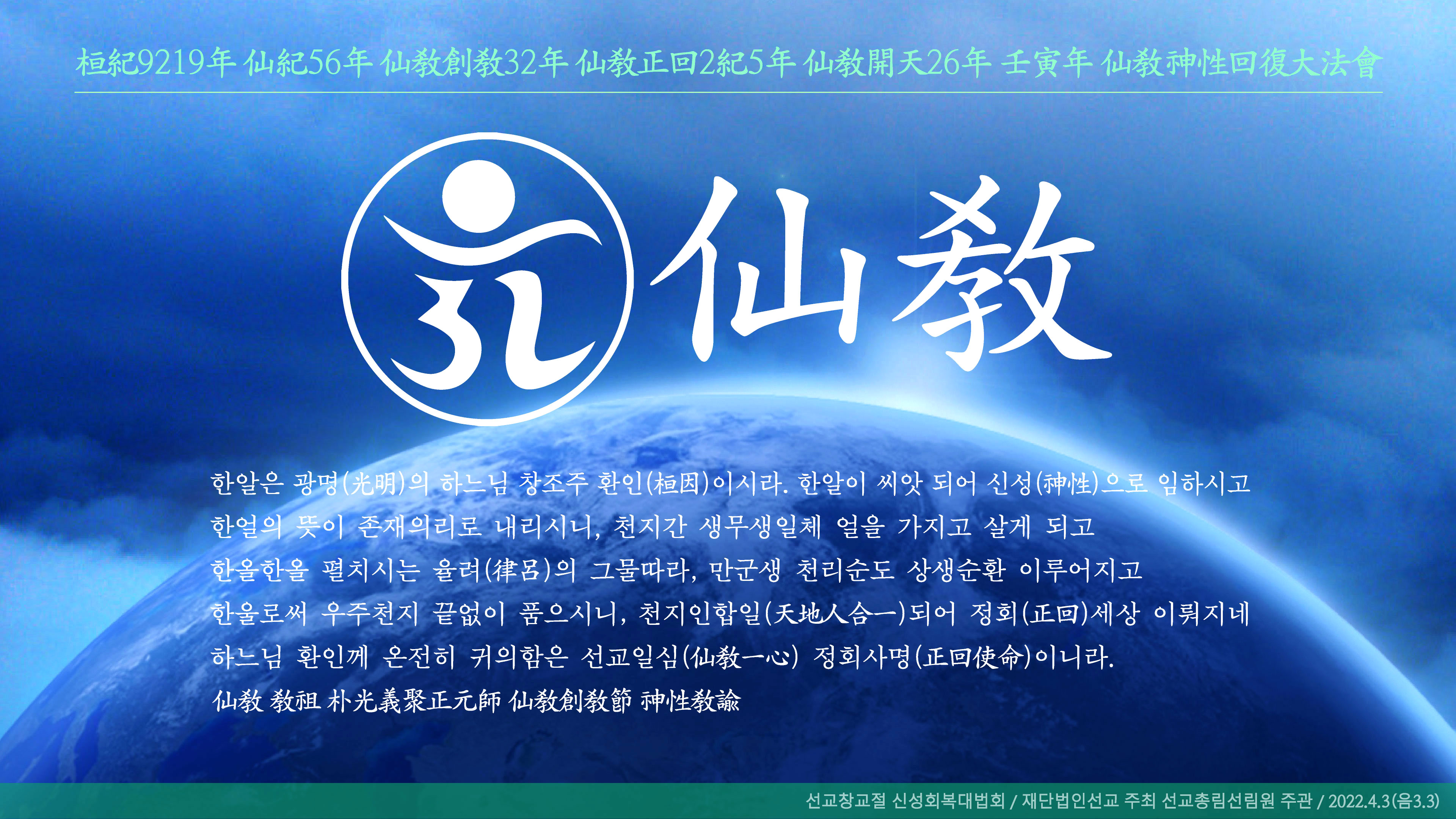 환기9219년 선기56년 선교창교32년을 맞은 2022년 임인년 음력 3월 3일 선교창교절에 창조주 환인하느님과 창교주 취정원사님, 선교 교단에 귀의하오며 감은공례를 올립니다. 일심정회합니다.