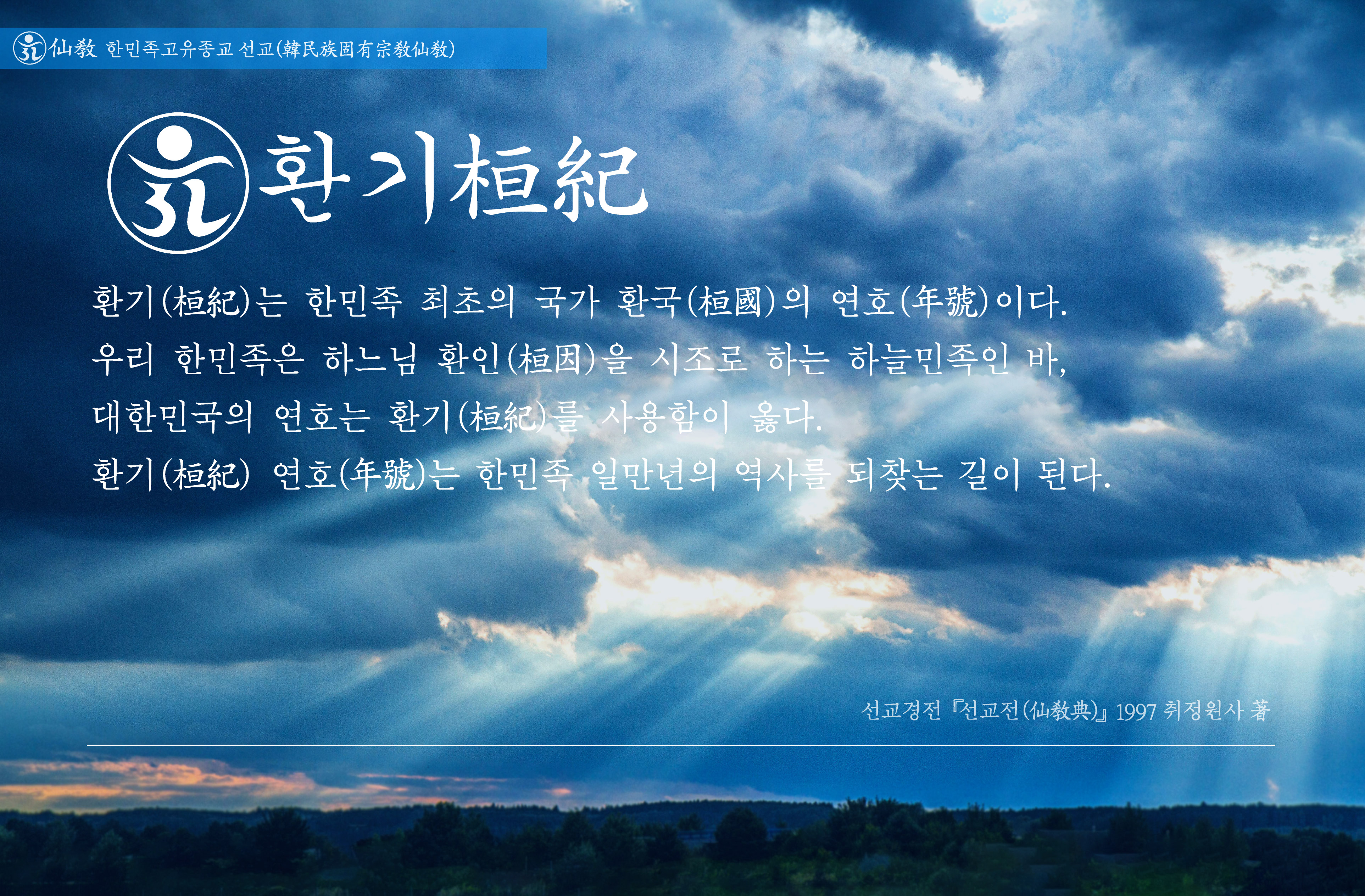 “한민족(韓民族)은 하늘민족이며 한민족의 연원은 하느님 환인(桓因)이시니 한민족이 세운 국가 환국(桓國)의 연호 환기(桓紀)를 사용하는 것이 마땅하다. 하느님 환인(桓因)께서 천지를 창조하시고 수억 년이 지나 환인(桓仁)께서 환국을 세우셨다. 환기(桓紀)는 환국기원(桓國紀元) BC7197 하원갑자(下元甲子)를 환기원년(桓紀元年)으로 한다.” _ 선교경전 《선교전(仙敎典)》1997. 선교 교단 창설자 취정원사(聚正元師) 「환기(桓紀)」 교유(敎諭)