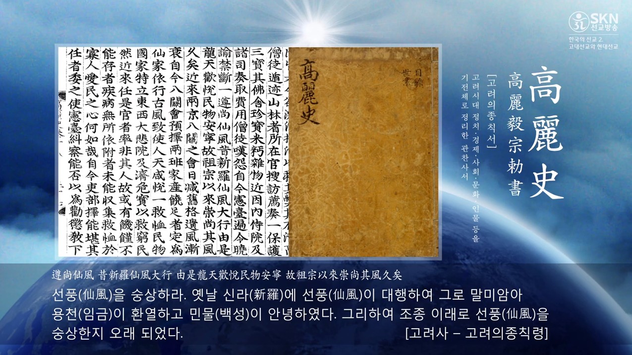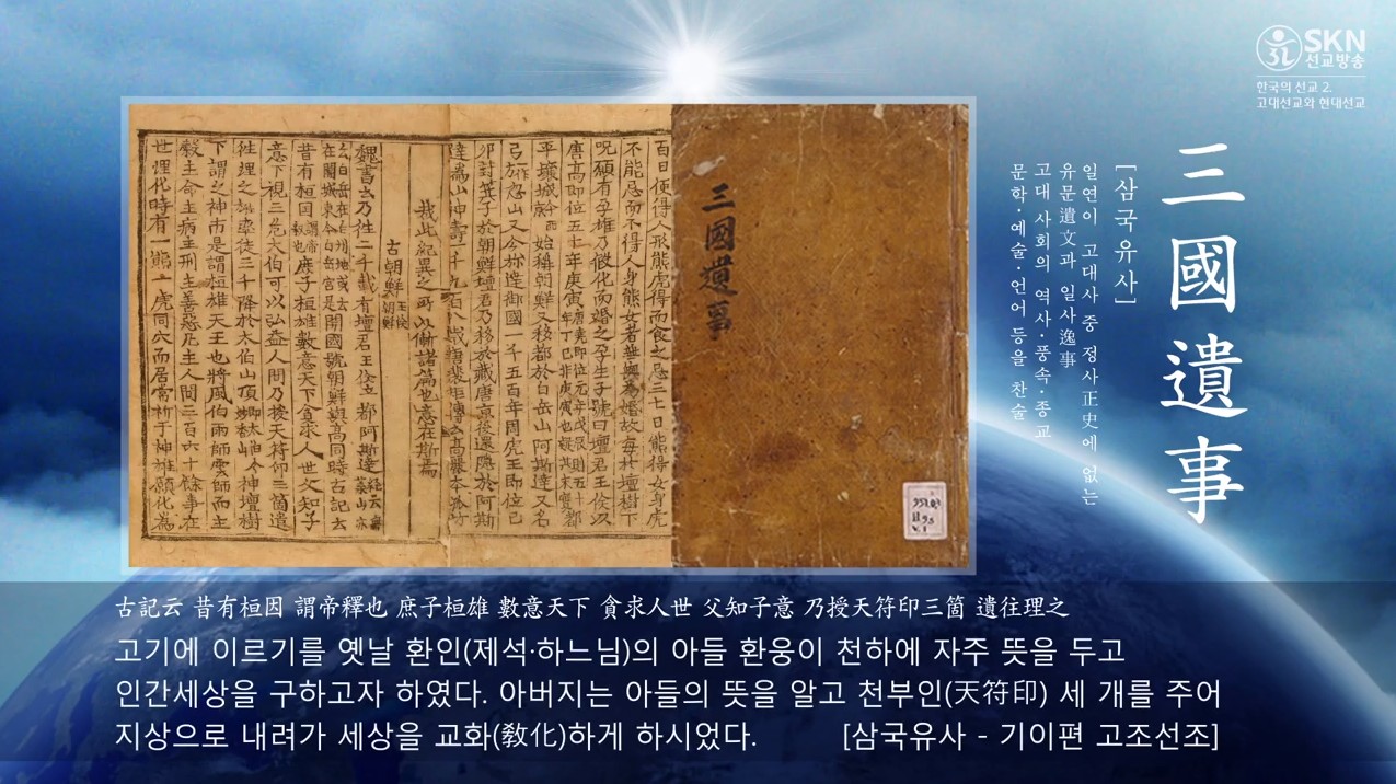 「우리 한민족 고유종교는 선교(仙敎)다.」 상고시대로부터 전하는 고대선교(古代仙敎)는 종교(宗敎)라는 명칭이 대두되기 이전, 하늘의 교화(敎化)로써 존재하였고 환인(桓因)께서 내리신 천부인(天符印)으로부터 시작되어 환웅과 단군으로 이어지는 종맥(宗脈)으로 계승되어, 하느님 환인을 우러러 섬기며 하늘의 교화인 홍익인간 재세이화를 실현하는 한민족의 고유종교 선교가 한국의 민족종교로써 엄연히 존재하고 있는 것이다.