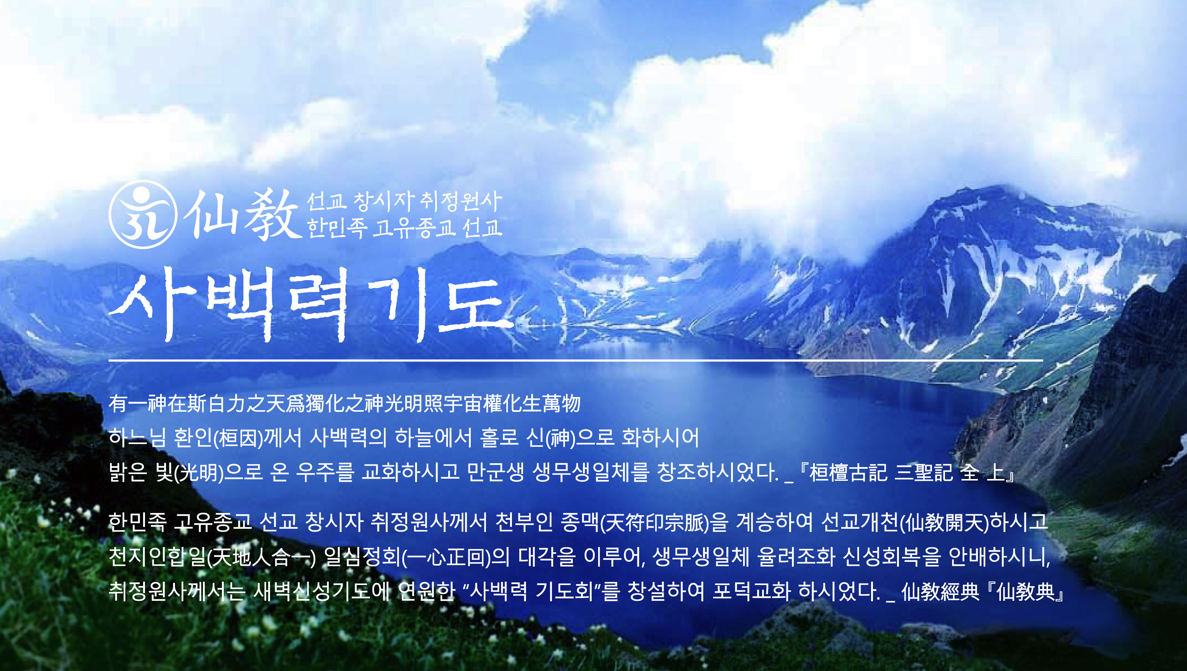 한민족 고유종교 선교(韓民族固有宗敎仙敎) 창시자 취정원사(聚正元師)께서, 한민족의 하느님 환인상제(桓因上帝)를 모시어 섬기는, 우리 한민족의 하느님 성전 환인성전(桓因聖殿)을 개원하시고, 사백력 기도회(斯白力祈禱會)를 결성하여 우리 민족의 민족혼(民族魂)을 부활하시니,
