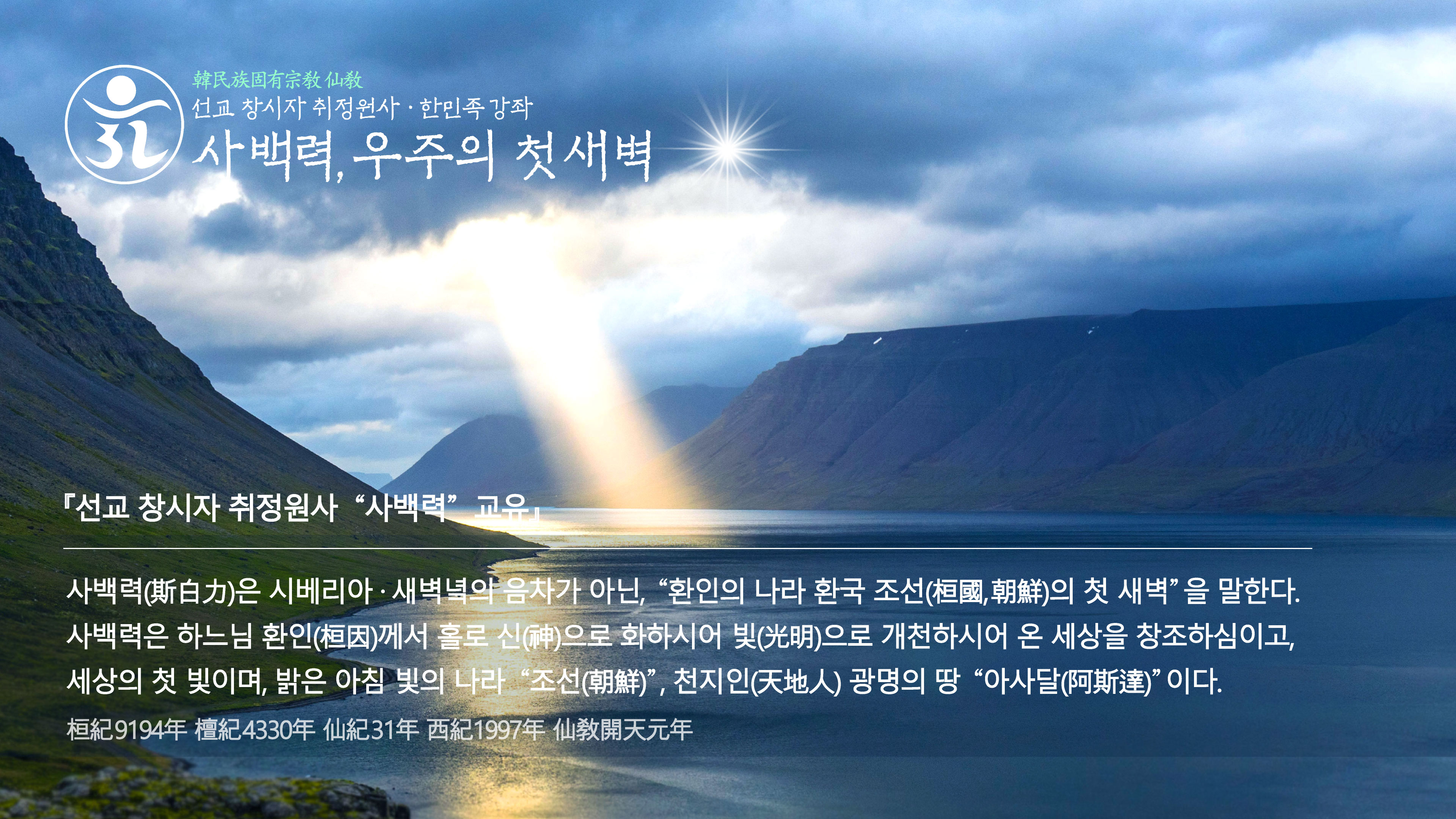 그러므로 우리 한반도는 하느님 환인(桓因)께서 처음 만드신 나라 환국(桓國)이며, 천지창조가 이루어지고 우주의 첫 새벽이 열린 바로 그곳 조선(朝鮮)이다. 그래서 『桓檀古記』에 이르기를 “吾桓建國最古, 우리 환의 건국은 세상에서 가장 오래된 일이다.”라는 말은 바로 사백력(斯白力)의 의미를 내포하고 있는 것이다.