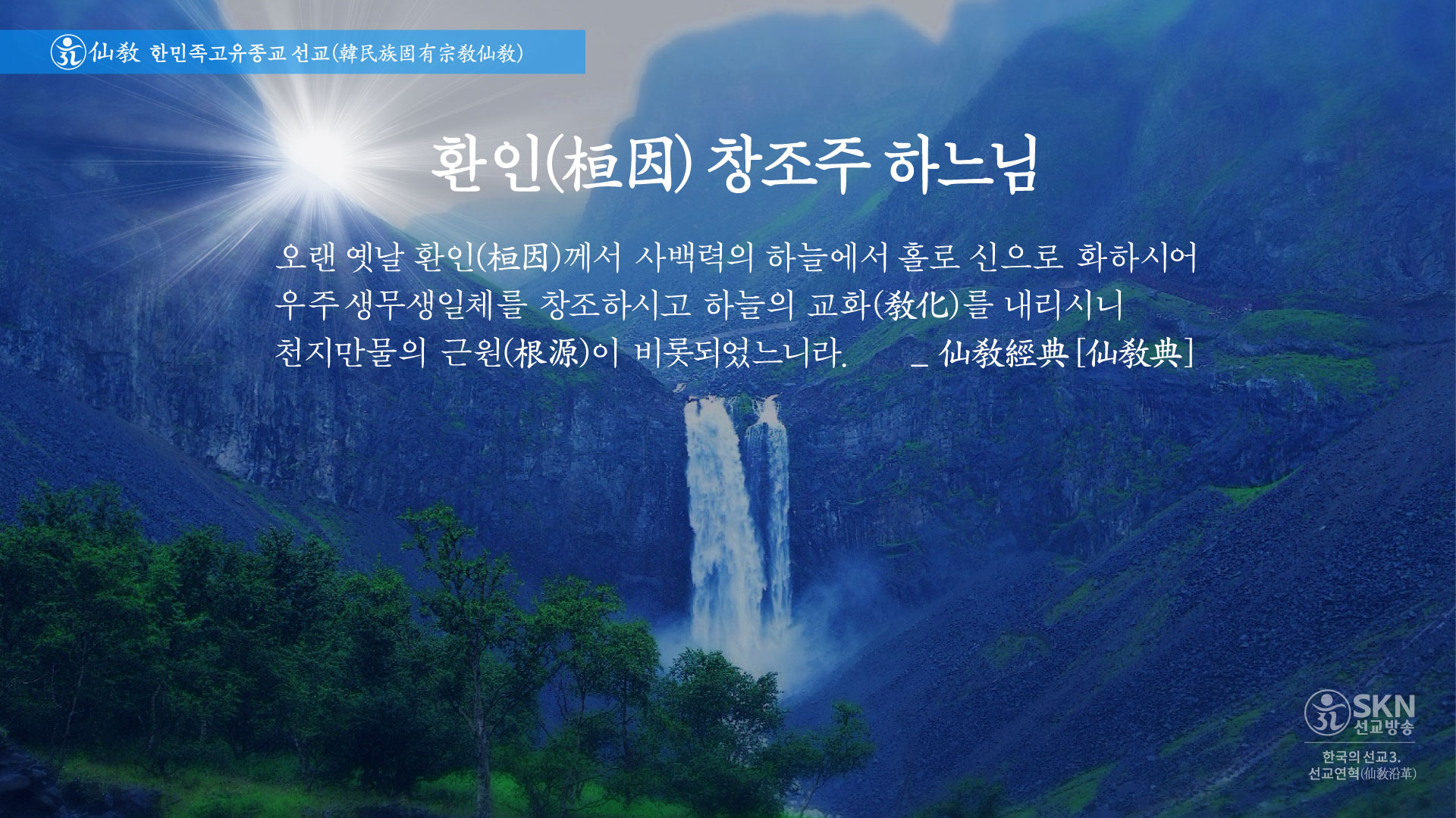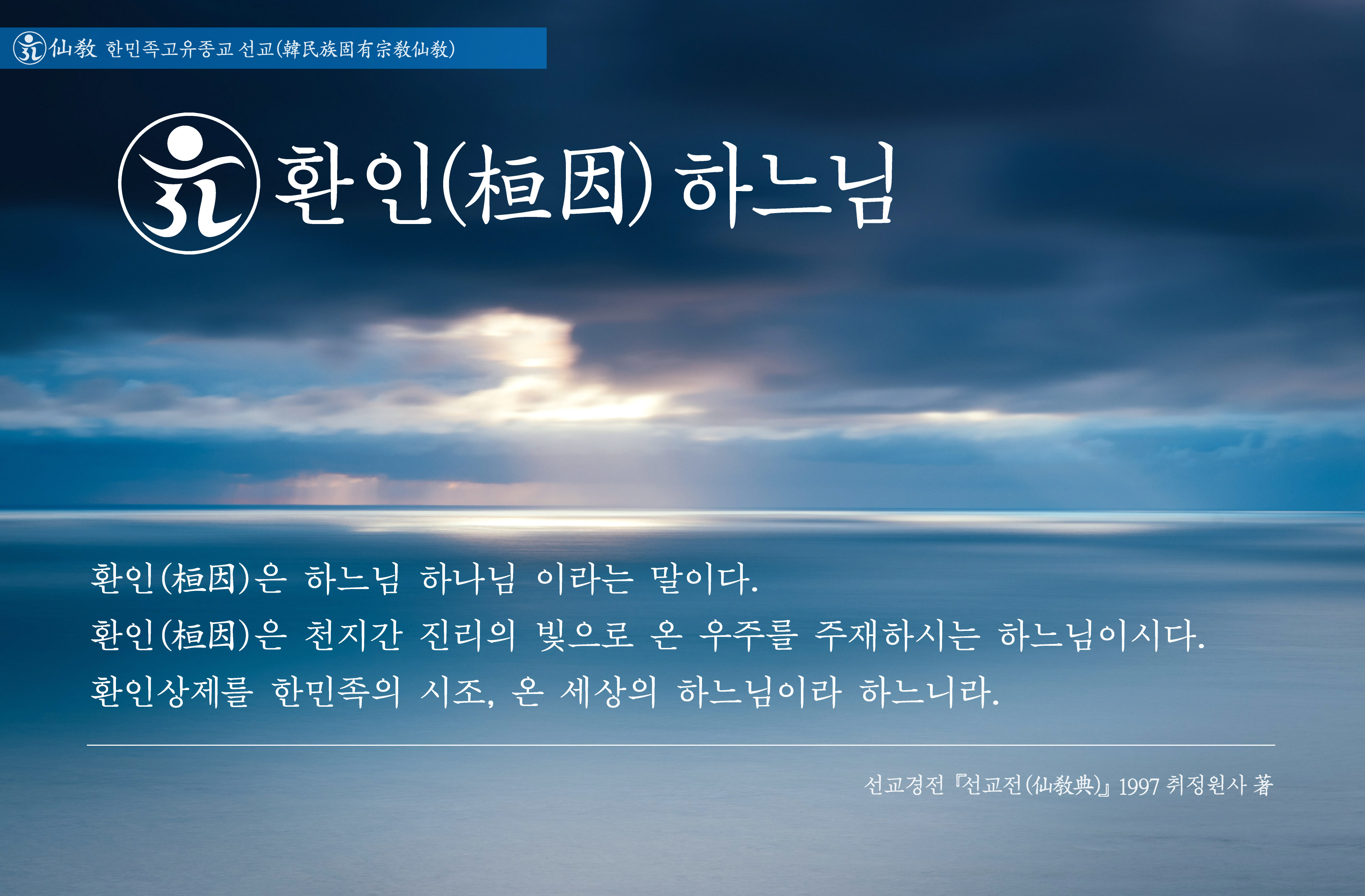 「 “환인(桓因)은 상천궁극위 하느님(上天窮極位桓因上帝)이시다. 환인(桓因)은 한민족의 시조이시며, 온 세상의 하느님이시며, 환인상제(桓因上帝) 환인천제(桓因天帝)라 한다. 환인(桓因)은 환인(桓仁) · 환웅(桓雄) · 단군(檀君)으로 이어지는 상고대(上古代)의 연원(淵源)을 열으신 상천(上天) 궁극위(窮極位)의 최고신(最高神) 이시다. 환인(桓因)께서는 홀로 신으로 화하시어(獨化之神) 온 세상을 창조하신 하느님이시며, 한민족고유종교 선교(仙敎) 교단의 신앙대상이다. 선교 교단은 오로지 환인(桓因)을 하느님(上帝)으로 신앙하며, 진리의 근원(根原), 한민족의 본원(本源)으로 섬긴다.”