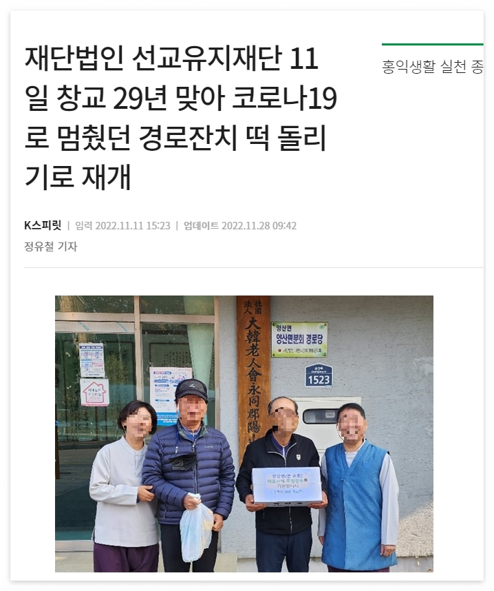 가. 제목 : [반론보도] <민족종교 선교 11일 창교 29년 맞아 코로나19로 멈췄던 경로잔치 떡 돌리기로 재개> 관련