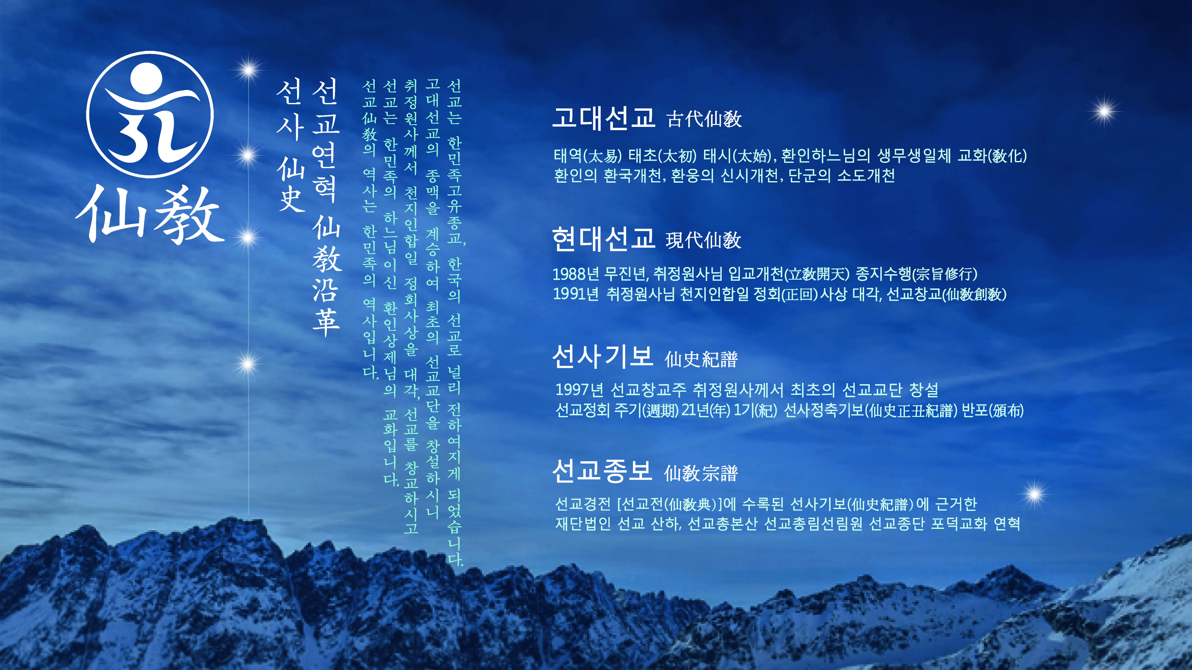 선교 교조 취정원사(聚正元師)께서 환인(桓因) 하느님의 개천입교(開天立敎) 교유에 따라, 설교지본 천지인합일 정회사상(設敎之本天地人合一正回思想)을 창교종리로하여 “선(仙)”의 “교(敎)”를 세우 선교 교단을 창설하여 포덕교화를 시작했던 1980년대 후반 ~ 1990년대는 우리의 선(仙)이 외면받던 시절이었습니다.