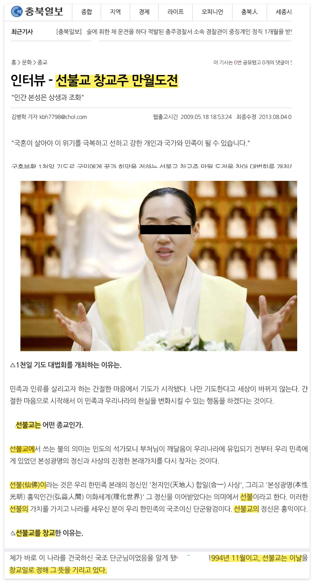 ▲ 3. 선불교 창교주 만월도전 / 선불교 창교일 11월 11일 (충북일보 2009.5.18)