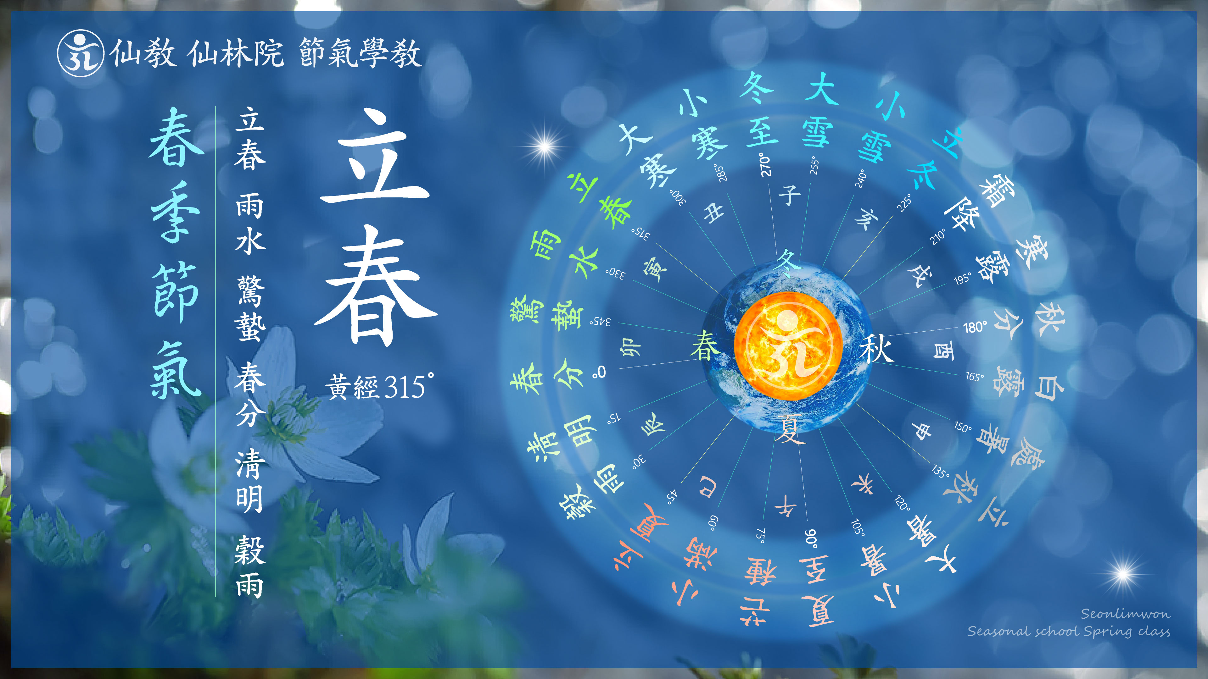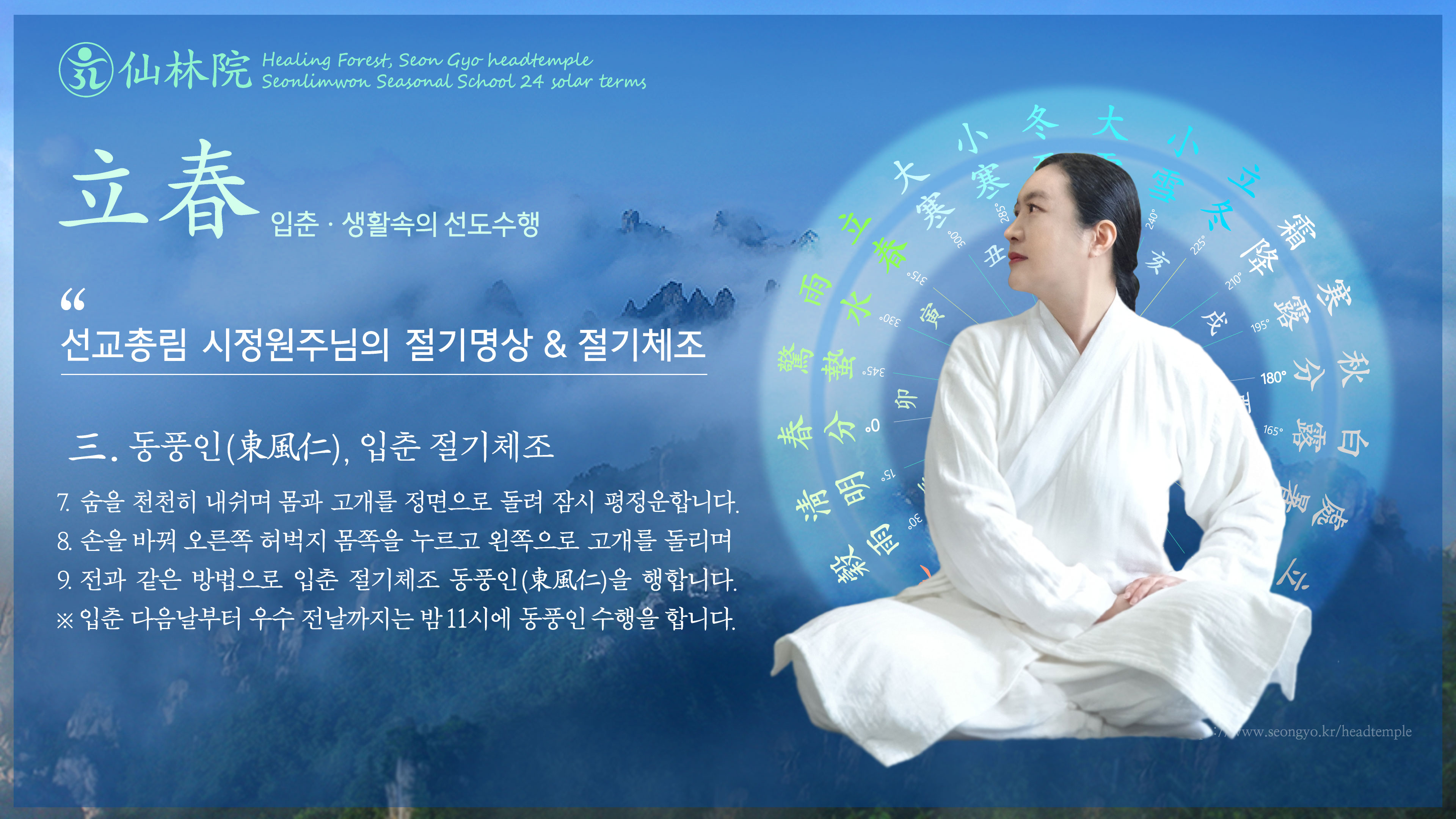 [선교총림 시정원주님 선도선법(仙道禪法)] 입춘(立春) 절기명상 · 절기체조 입춘立春은 일년 절기력(節氣曆)의 첫번째 절기로 봄이 들어서는 절기. 황경 315도. 대한과 우수 사이에 듭니다. 입춘