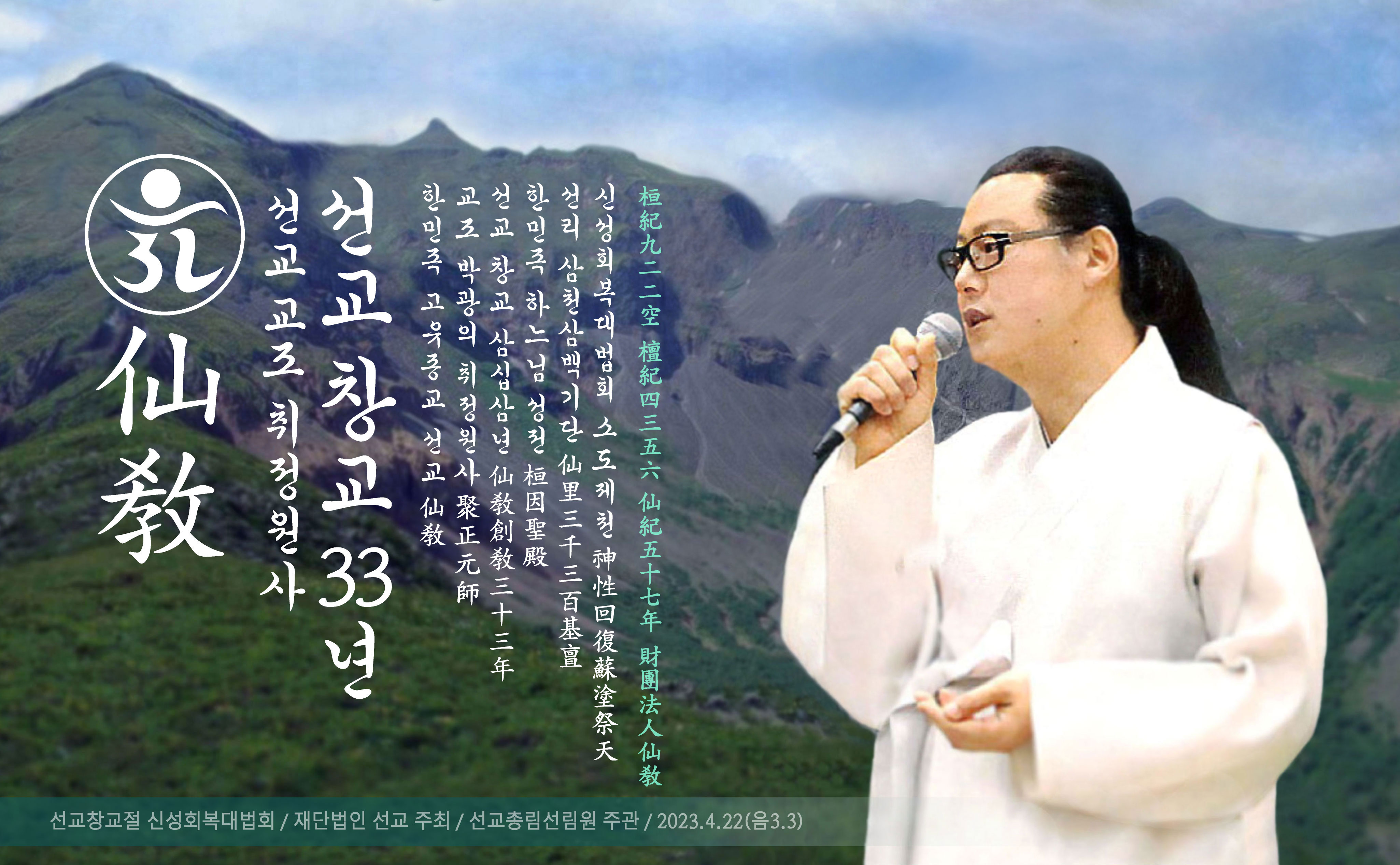 2023년 선교창교 33년 신성회복대법회는 선교(仙敎)의 우주관(宇宙觀)인 33천(三十三天)을 경배하는 33공천배례로 시작하여, 선교 교단이 진행해온 “선가정, 한민족 하느님성전 모시기”에 따른 선리(仙里) 삼천삼백기단(三千三百基亶) 결성과 선교 창교의 배경이 되는 1988년 무진년 취정원사 선교개천입교(仙敎開天立敎)의 기념의식으로 진행되었습니다.