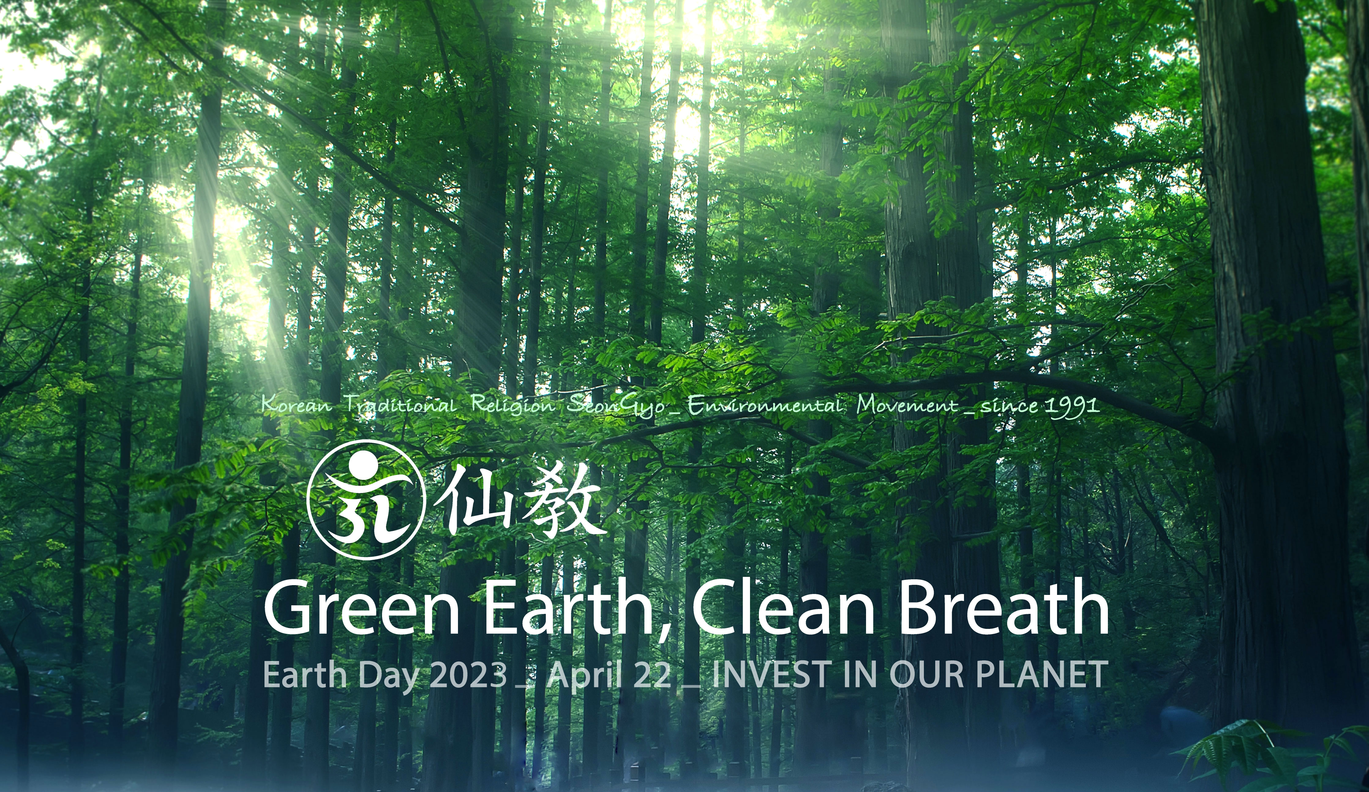 2023년 세계 지구의 날 주제는 2022년에 이어 ‘지구에 투자하자(INVEST IN OUR PLANET)’입니다. 선교종단 재단법인 선교는 환경부의 기후변화주간 운영취지 탄소중립을 실천하고 환경보전의 의미를 되새기며, 매년 24절기 청명부터 곡우 절기 즈음까지 선교 창교절 제천의식과 지구의 날 기념행사를 열어 ‘푸른지구 맑은숨’을 주제로 인류의 신성회복 기원이 담긴 신단수 숲을 조성해왔습니다.