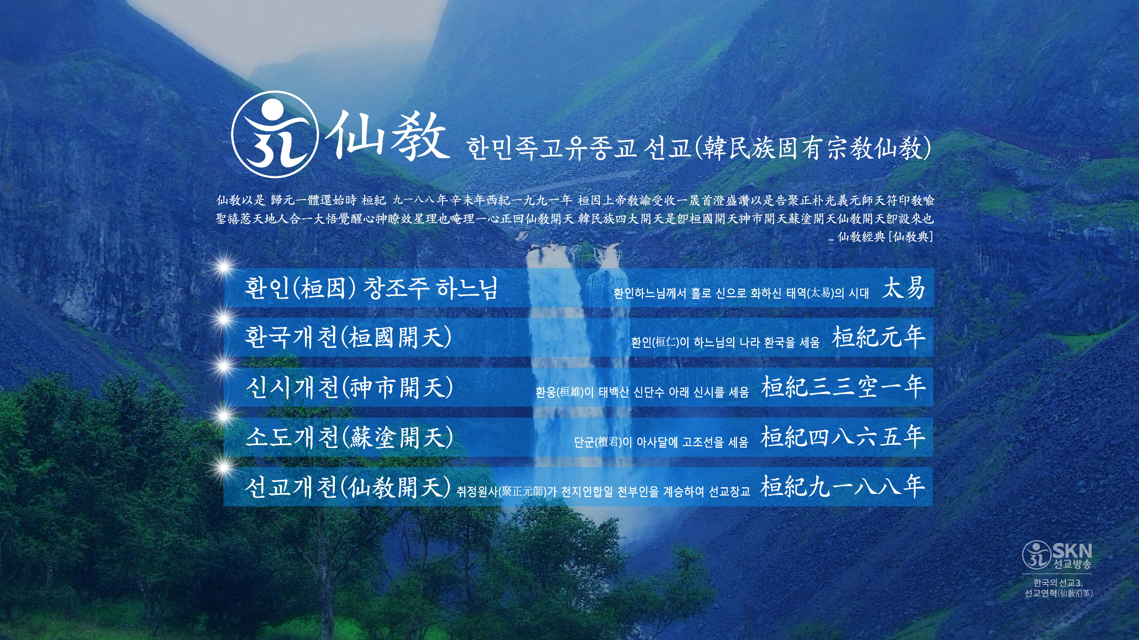 하느님 환인(桓因)의 태역 · 환인(桓仁)의 환국개천 · 환웅의 신시개천 · 단군의 소도개천 · 취정원사의 선교개천
