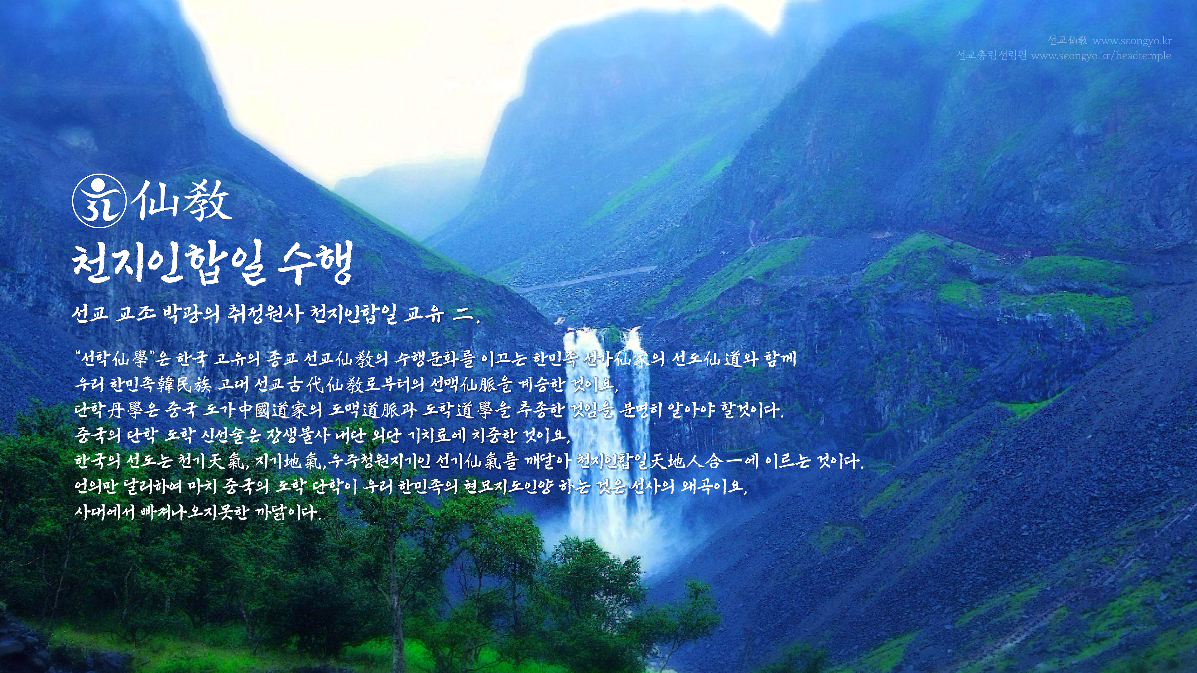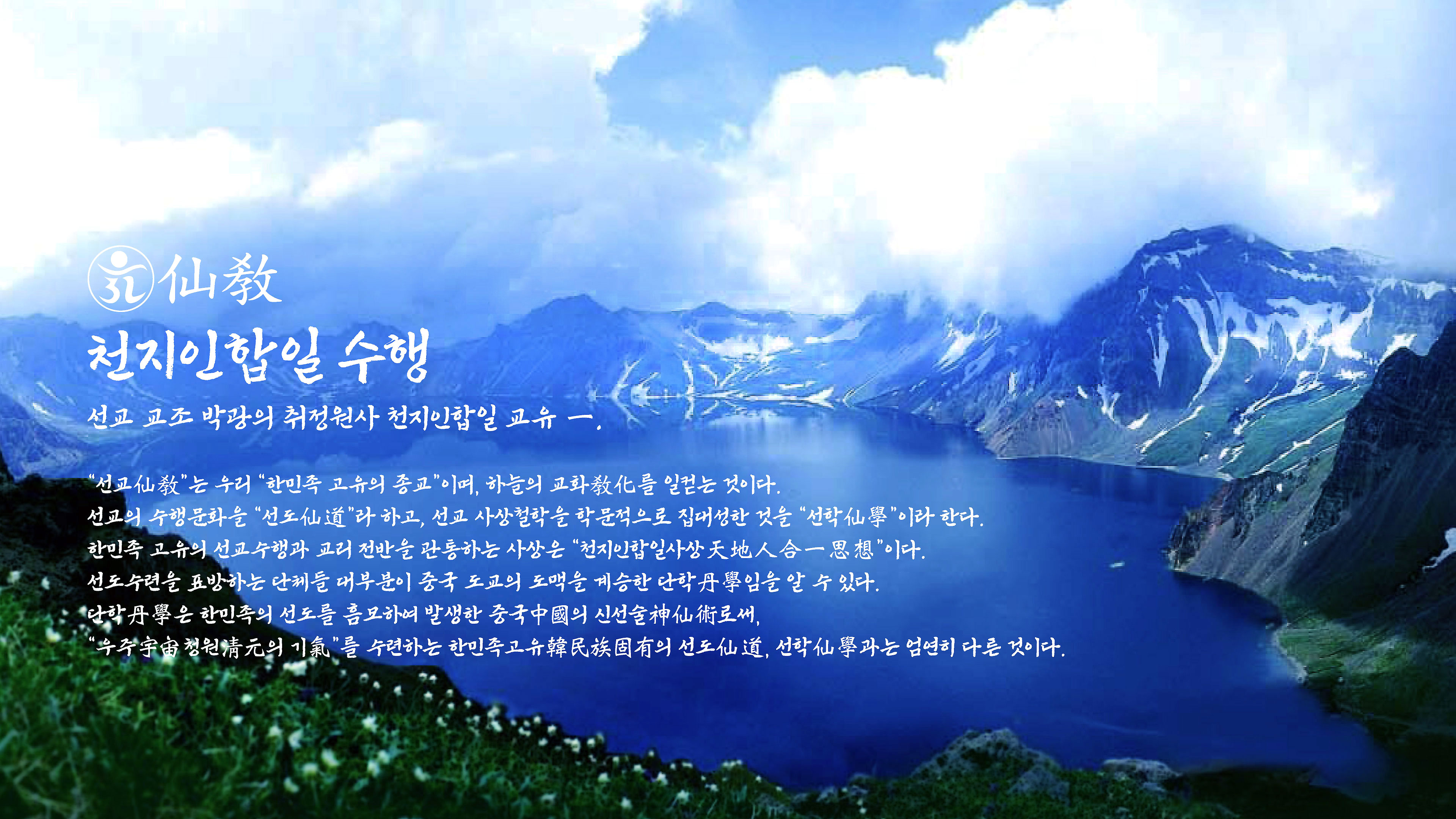 우리 한민족의 선도는 천기(天氣)와 지기(地氣) 우주청원지기 선기(仙氣)를 깨달아 천지인합일(天地人合一)에 이르는 것. "천지인합일 수행"은 하늘과 땅과 사람이 하나되어 일심(一心)으로 정회(正回)하는 것이다. "천부인(天符印)의 진리"로써 정신을 깨쳐 온 세상을 광명(光明)으로 교화하는 것이 천지인합일 선교의 궁극지행이다. _ 仙敎修行