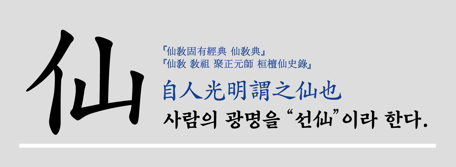 선(仙)은 신성의 빛으로 깨어나 신성을 회복하고(神性回復) 천지인의 합일(天地人合一)을 이룬 사람의 광명(光明)인 것이니, “선(仙)”을 교유 하건대 ‘선(仙)은 천지인(天地人)의 합일(合一)이요, 천부인(天符印)의 진리(眞理)를 의미한다.’ 천지인합일은 곧 천지인의 정회(正回)요, 하늘과 땅과 사람이 하나되어 홍익인간 재세이화를 실현함이다.