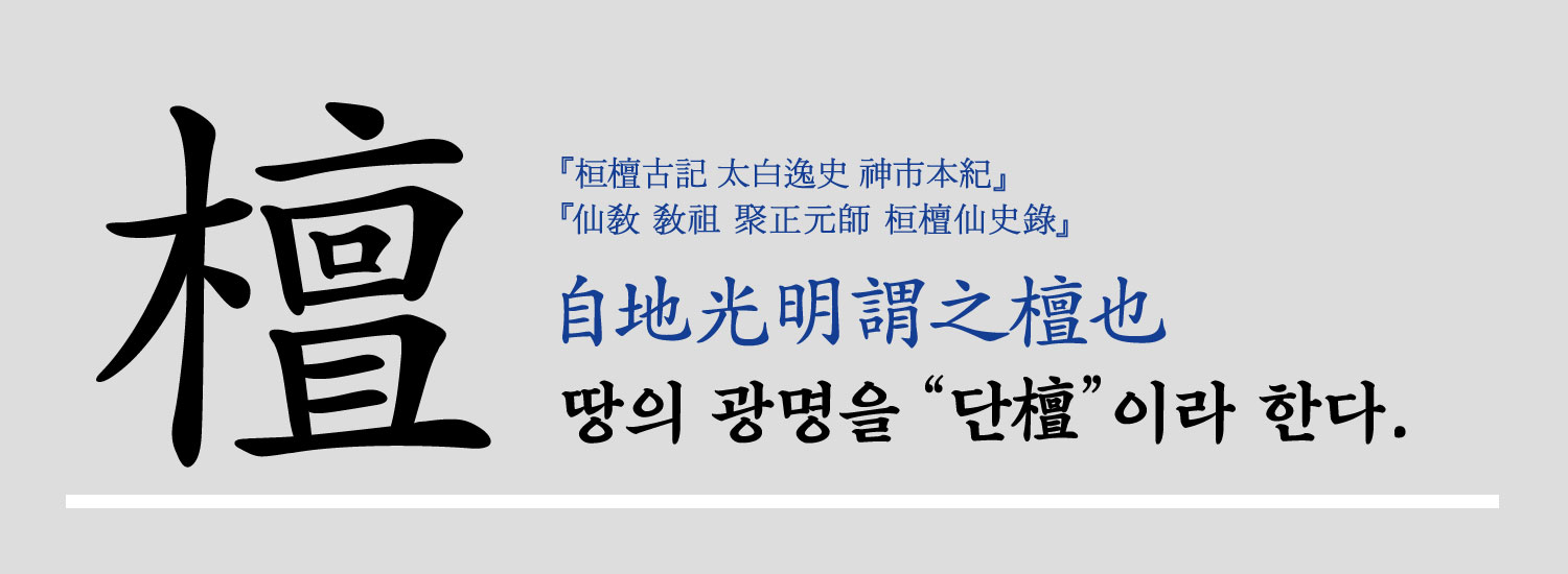 땅의 광명을 “단(檀)”이라 함은, 환인(桓因) 하느님께서 하늘의 광명으로 이 땅을 밝게 비추심이라. 환웅천왕은 하늘의 광명, 하늘의 교화 선교(仙敎)로써 교화하여 밝음의 나라 신시배달국을 세웠으며, 단군왕검은 밝은 땅 아사달에 도읍을 정하여 동방의 해뜨는 나라 조선(朝鮮)을 열었다. 환인(桓仁)의 환국개천(桓國開天), 환웅(桓雄)의 신시개천(神市開天), 단군(檀君)의 소도개천(蘇塗開天)의 국·시·도(國·市·塗) 다시말해 환국·신시·소도(桓國·神市·蘇塗)에 내린 신성한 빛, 땅의 광명(光明)을 “단(檀)”이라 하는 것이다.