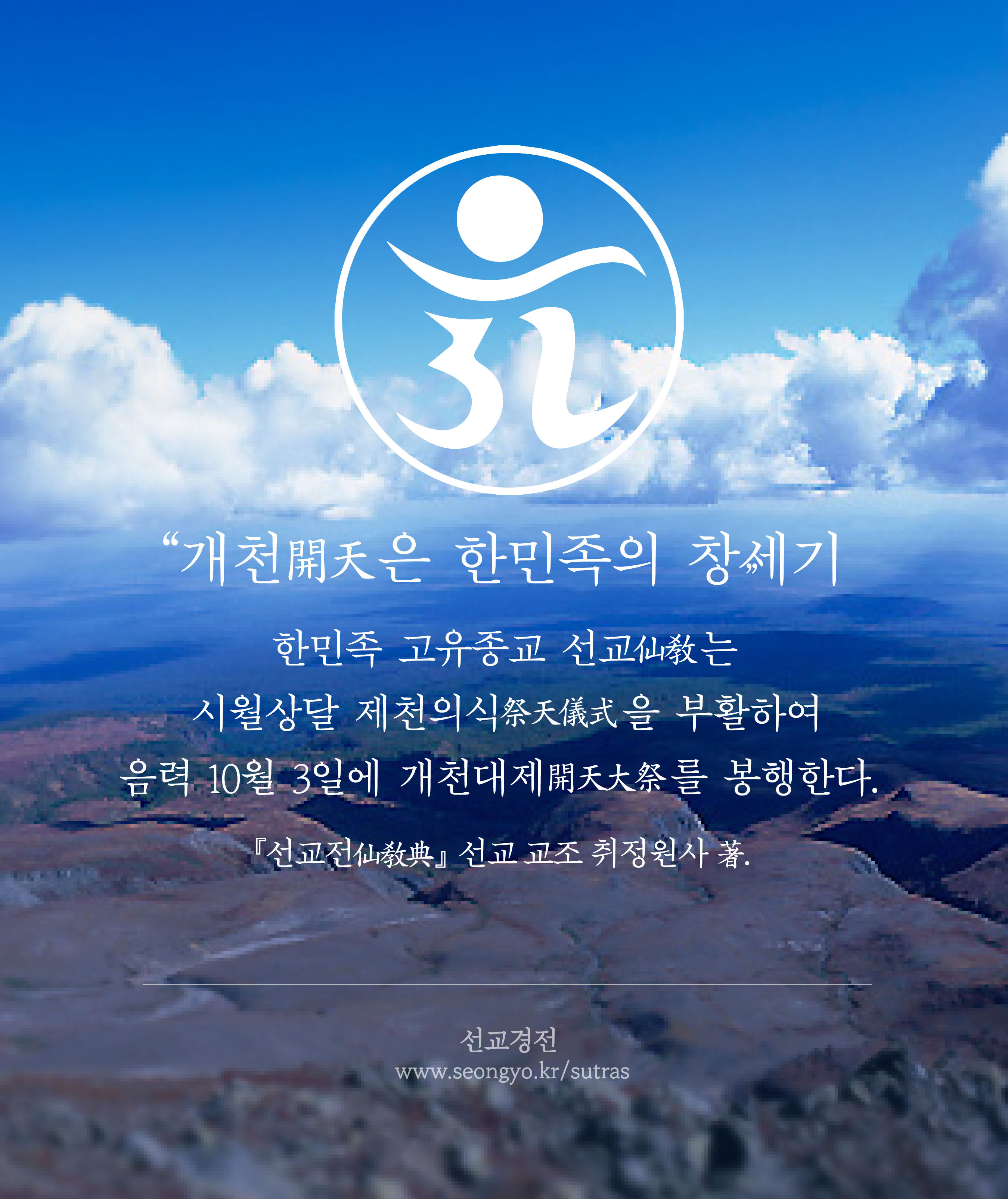 선교 교조 취정원사 개천절 교유 「한민족의 창세기 개천(開天)」 / 「 개천(開天)”은 환인상제(桓因上帝)께서 태역무극(太易無極)의 때에 홀로 신으로 화하시어 천지(天地)와 하늘과 땅 사이 생무생일체를 창조하신 “한민족의 창세기”를 말함이다. 한민족은 환인(桓因)께서 천지인 삼재의 조화(造化)로 세상을 창조하시고 율려(律呂)로써 교화하신 은혜에 제천(祭天)으로 보답하였으니, 문헌으로 고증되는 국가의례 시월 상달 고구려의 동맹(東盟), 동예의 무천제(舞天祭), 삼한의 시월제(十月祭), 강화도 마니산 참성단(塹星壇), 태백산 천제단(天祭壇), 원구단(圓丘壇) 또한 일 만년전 환인시대부터 전하는 개천의 역사와 제천의식의 전통을 계승한 것임을 알 수 있다. 이에 “개천절의 유래”를 단군조선의 건국 기념일로만 인식하는 것을 넘어서 “한민족의 창세기”로 정립하는 것이 우리 한민족의 사명임을 천명한다. 개천(開天)과 제천의식(祭天儀式)의 역사를 바르게 아는 것이 잃어버린 상고(上古)의 역사를 되찾아 한민족의 시원과 창세기를 밝히는 길이 될 것이기 때문이다. 한민족에게는 4번의 개천(開天)이 있으니 환인(桓仁)의 환국개천(桓國開天) · 환웅(桓雄)의 신시개천(神市開天) · 단군(檀君)의 소도개천(蘇塗開天) 그리고 귀원일체환시시(歸元一體還始時) 1997년 정축년의 선교개천(仙敎開天)이다. 이는 모두 하느님 환인(天帝桓因)의 율려교화(律呂敎化)에 따라 한민족 개천(開天)의 역사를 계승한 것이다... (이하생략)