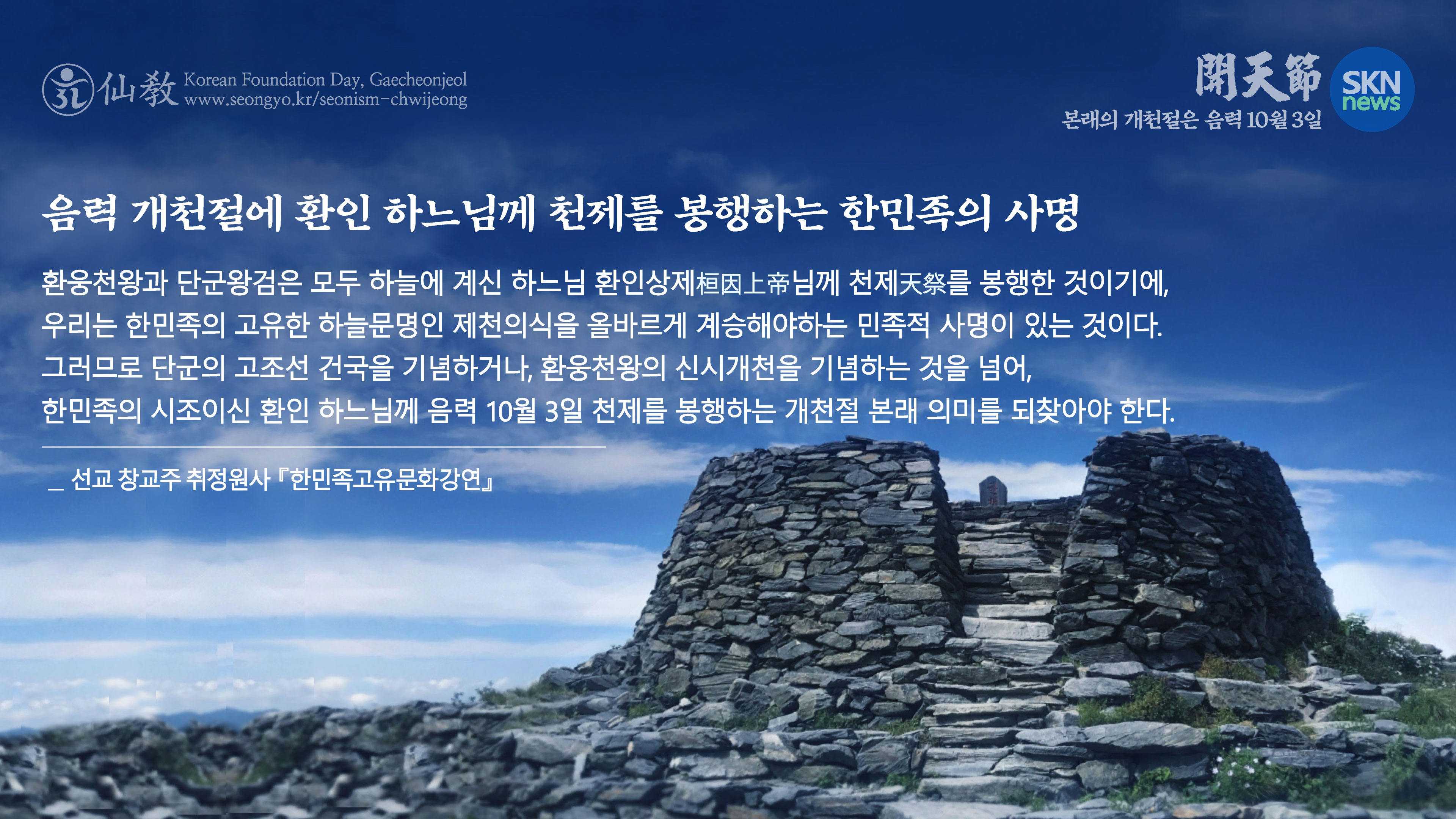 환기9219년 단기4355년 선기56년 선교창교32년 2022.10.3 선교창교주 취정원사 「개천절, 한민족 고유문화 강연회」 본래의 개천절은 시월상달 초사흘 음력 10월 3일, 하느님 환인상제님께 천제를 봉