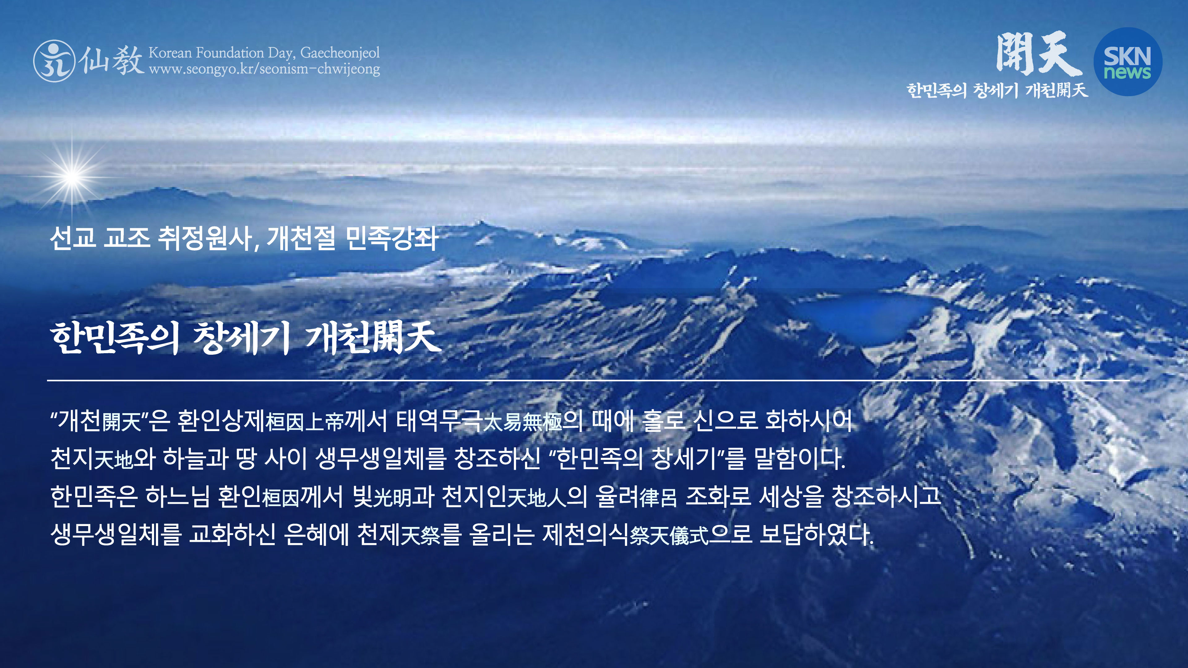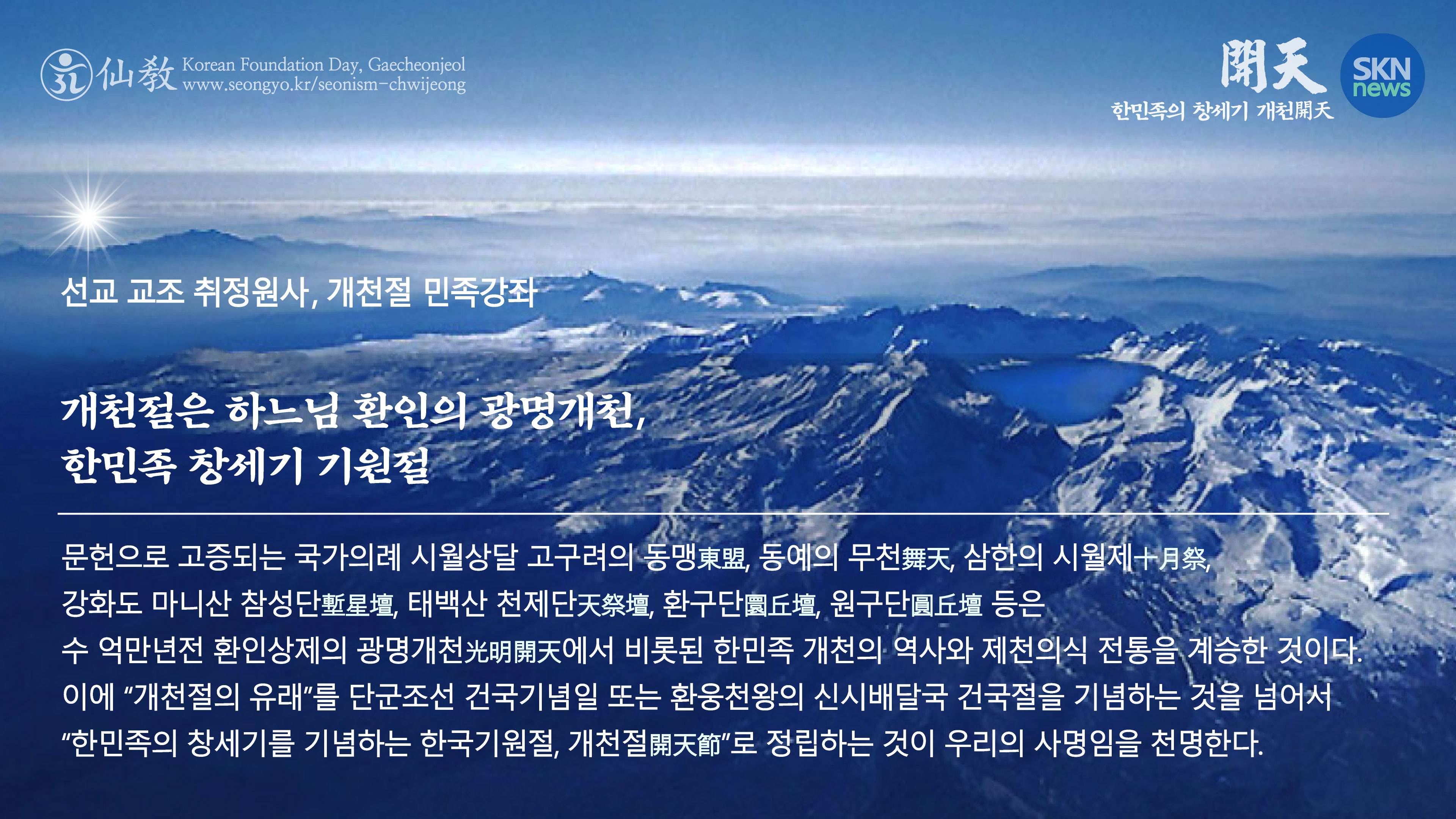또한 “한민족의 시조이시며 온 세상의 하느님이신 환인(桓因) 께서는 사백력지천에서 우주의 첫빛으로 첫새벽을 열으시어 최초로 하늘을 열러 교화하시었으니, 이를 광명개천(光明開天)이라 한다. 그러하니 개천절(開天節)은 단군의 고조선 건국 또는 환웅의 신시 개천을 기념하는 것을 넘어, 한민족 개천사(開天史)의 뿌리를 찾고 연원을 밝히어, 개천(開天)은 한민족의 창세기임을 깨닫고 개천절에 기리는 대상은 하느님 환인(桓因) 이어야 함을 바르게 깨달아야 한다”고 설파하였습니다.