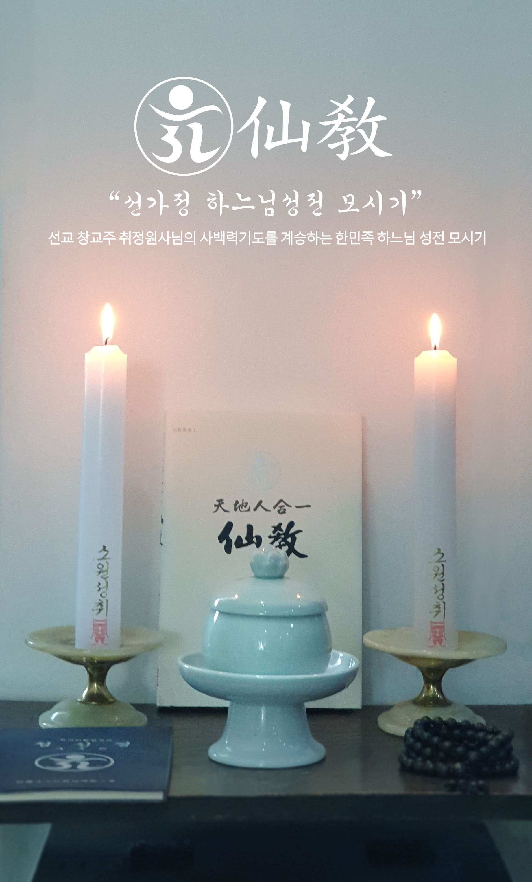 ○ 한민족고유종교 선교 하느님 성전 「환인성전」/ 민족종교 선교 창교 32년, 선가정 “한민족 하느님 성전” 모시기 / 선교 창교주 취정원사님의 “사백력 기도”를 계승하는 선교인의 청정수행 / 2023년 계묘년, 민족종교 선교 창교 33년을 맞이하는 선교제일력사(仙敎第一力事). 선교 창교주 박광의(朴光義) 취정원사(聚正元師)께서는 선교경전 『仙敎典』(1991~1997. 취정원사 著)에 「환인성전숭천기(桓因聖殿崇天基)」를 실어 선교수행대중에 한민족 하느님성전 “환인성전”에 대해 교유하셨습니다. “선가정, 한민족 하느님 성전 모시기”는 창교주 취정원사님의 “사백력기도(斯白力祈禱)”를 계승하는 선교수행대중의 청정수행(淸淨修行)과 신성회복을 통한 천지인합일 정회세상(天地人合一正回世上) 실현의 교두보가 될것입니다.