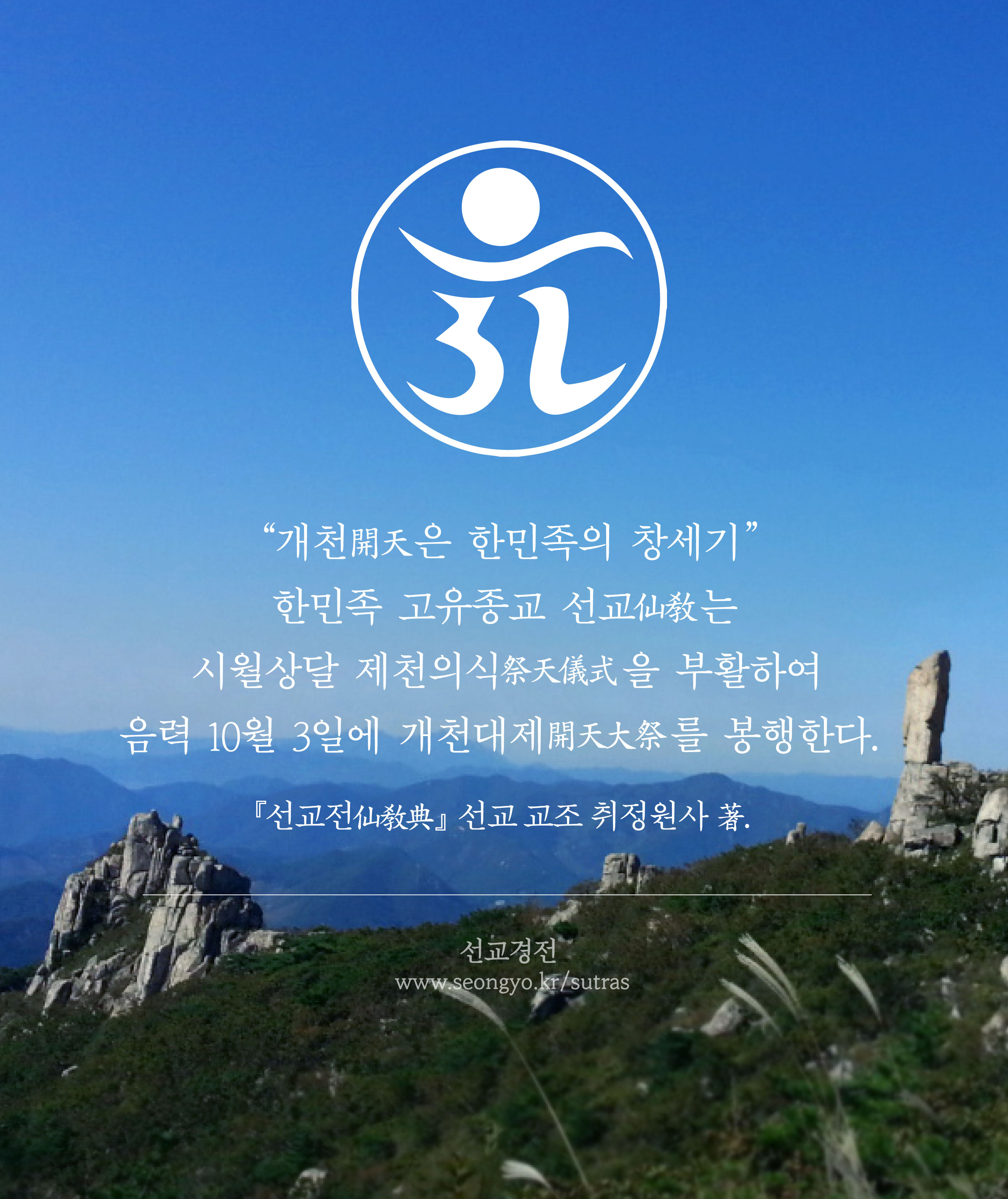 한민족 고유종교 선교(仙敎) / 한민족고유문화진흥원 / 음력 개천절 음력 개천절 陰曆開天節 본래의 개천절(開天節)은 시월 상달의 제천의식(祭天儀式) 음력 10월 3일에 하느님 환인(桓因)께 천제