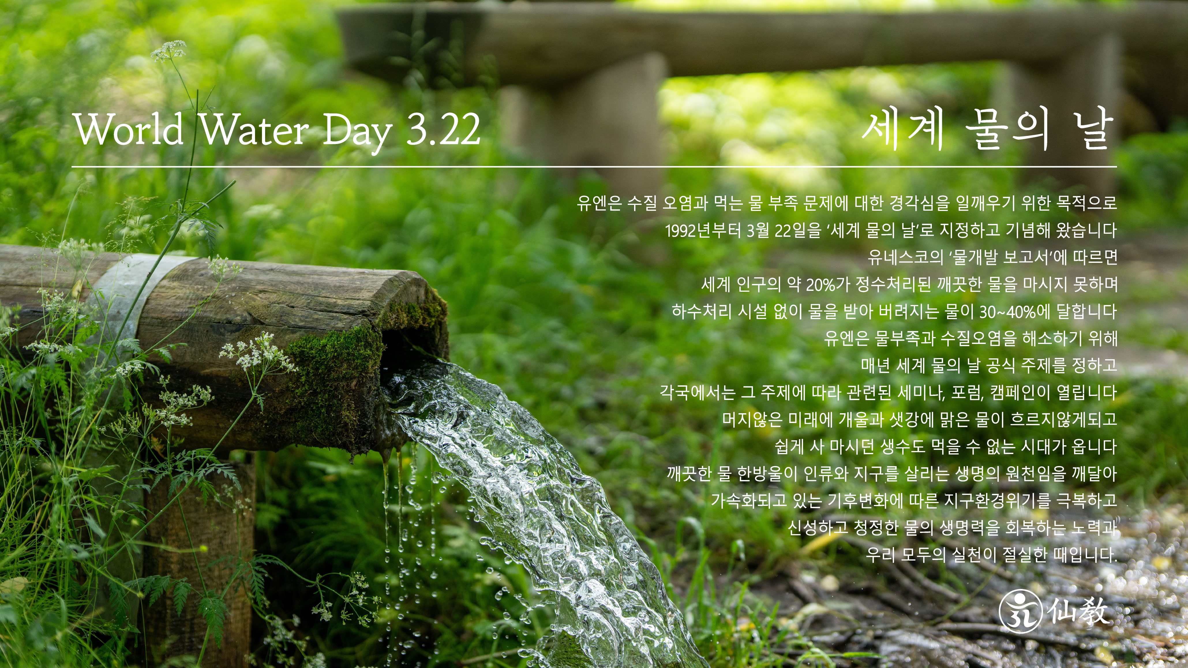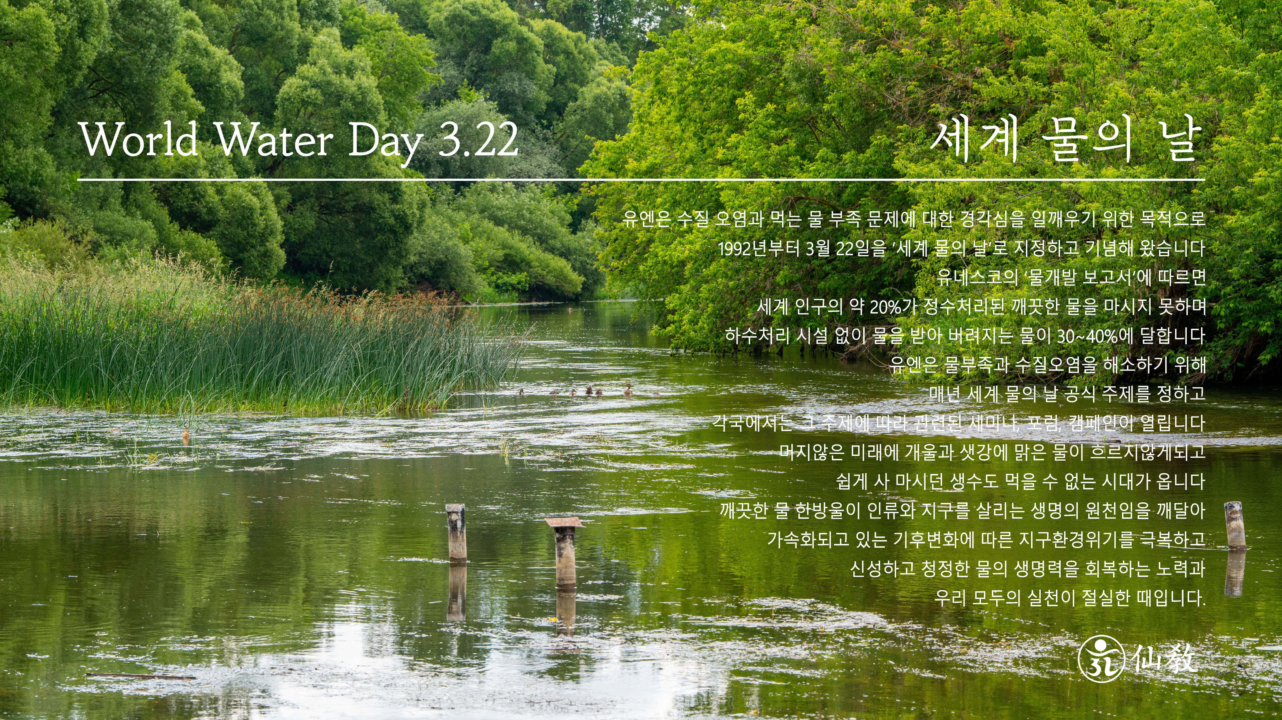 민족종교 재단법인 선교(仙敎)와 선교총림 선림원(仙林院)은 지난 3월 22일 환기9221년 선기58년 선교창교34년 갑진년 ‘세계 물의 날(World Water Day)’을 맞아 선교총림선림원 시정원주(時正原主)님의 주재로 ‘세계 물의 날, 정화수기도 명상법회’를 ‘산천법회(山川法會)’로 봉행했습니다. 선교 교단 유엔(UN)이 정한 ‘세계 물의 날’ 제정 취지에 동참하여, 세계 물의 날인 3월 22일 정화수기도와 명상법회를 통하여 물의 중요성을 일깨우고 있습니다.