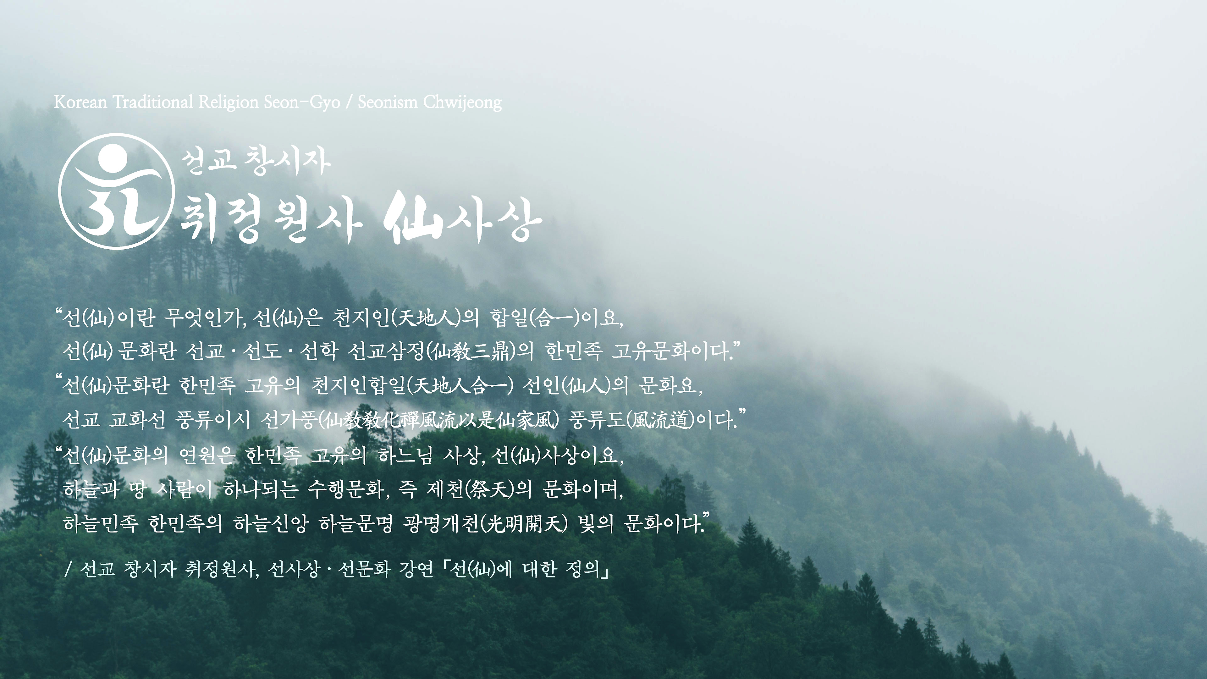 ※선교 창교주 취정원사께서 선교경전 [선교전]에 밝히어놓으신 '한민족고유선도 교유(韓民族古有仙道 敎諭)'와 선교강원(仙敎講院)에서 설(說)하신 '한국의 선도(韓國仙道)' 법문(法文)을 실어 수행대중에 전합니다.