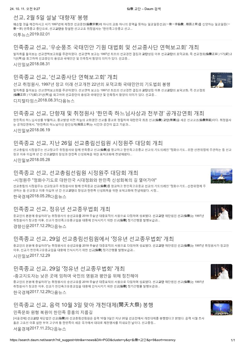 *다음(Daum) 뉴스를 중심으로 확인된 “선교(仙敎) 교단” 종사(宗史) _ (2024.10.11 기준)