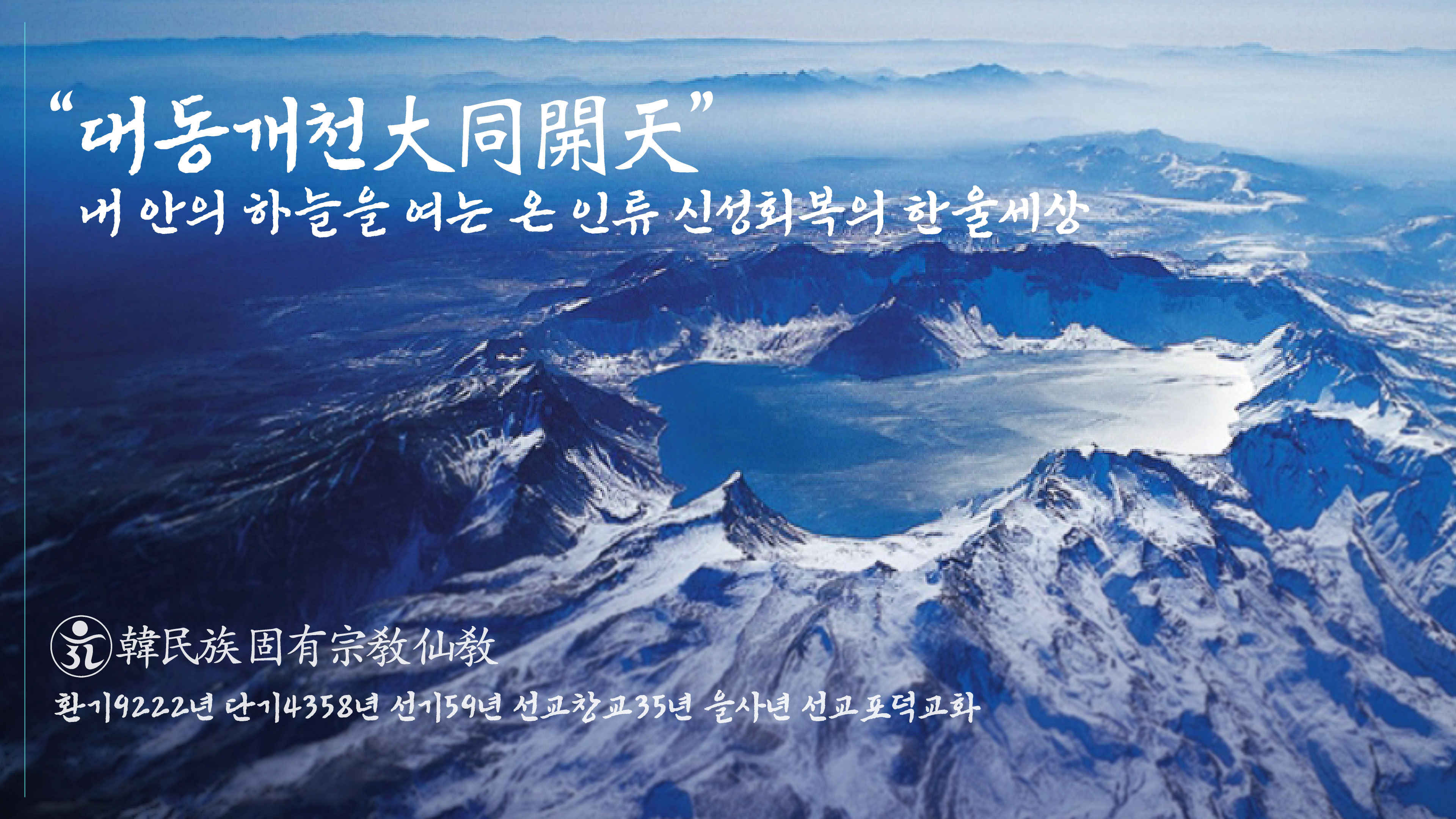 ‘한하늘 한민족 한자손이 이루는 대동개천(大同開天)’, 길고 어둡고 추운 겨울밤 동지가 지나면 새생명의 불씨가 살아나 대동세상의 횃불이 될 것이니, 내 안의 하늘을 열어 사람이 개천(開人)하면, 이 땅 온누리의 개천(開地)을 이루고, 하늘이 열리어 대동개천(大同開天) 한울세상, 참된 ‘대동세상(大同世上)’이 열린다. _ 聚正元師 乙巳年垂訓.