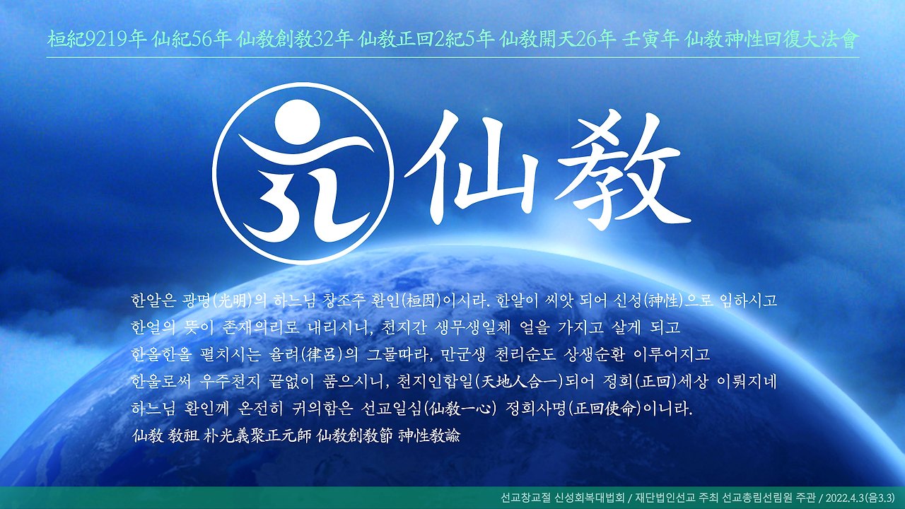 환기9222년 단기4358년 서기2025년 선기59년 선교창교35년, 선교 창교의 절기 청명(淸明)을 맞아 선제와 선도 선교인(仙敎人) 모두와 온 인류(全人類), 나아가 천지간 생무생일체(天地間生無生一切)가 신성회복(神性回復)하여 새 생명으로 찬란하게 빛나기를, 환인(桓因) 하느님의 향훈(嚮暈)을 빌어 다시한번 축원합니다. 일심정회(一心正回)합니다.