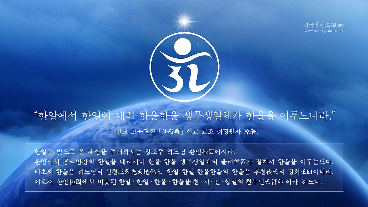 “환인(桓因)은 하느님, 일심(一心)의 본원(本源)” _선교경전 《선교전(仙敎典)》 신성교유(神性敎諭) 篇.