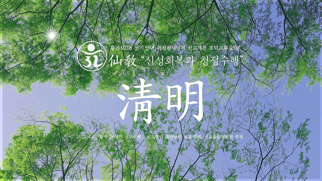 민족종교 선교, 청명 절기 “청정수행과 신성회복” 영상교화. 「선교 창교의 배경」 선교창교와 청명절의 신성회복. 선교 창교주 취정원사님 선교수행(仙敎修行) 선도(仙道) 대중포덕 교유 “24절기 청명 절기는 빛으로 온 세상을 주관하시는 환인상제(桓因上帝)의 향훈으로 천지(天地)가 맑고 밝게 빛나는 시절이다. 선제선도는 청정수행으로 환인하느님의 향훈을 신성(神性)으로 발현하여 천지와 함께 청명(淸明)하게 빛나야 할 것이며 동시에 불안과 고통 속에 살아가는 이 시대를 환하게 비추어야 한다.”