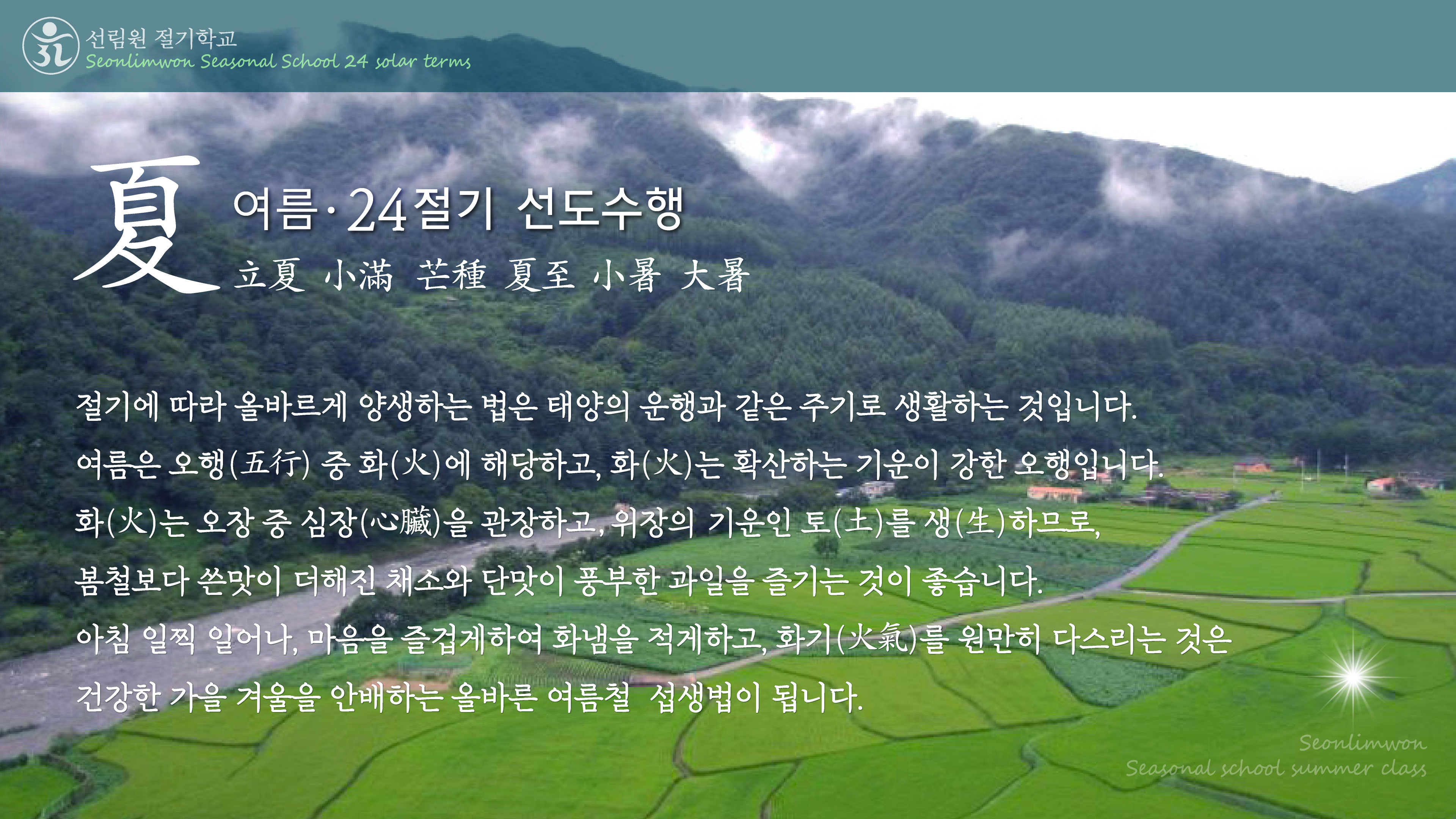 『 입하(立夏)는 여름의 시작을 알리는 절기로 양력 5월 5일 경이며 태양이 황경 45°의 위치에 있을 때입니다. 입하는 여름에 들어섰다는 의미로, 입하 절기 무렵이면 봄꽃이 지고 녹음이 짙어지기 시작합니다. ○ ‘보리가 익을 무렵의 서늘한 날씨’라는 의미로 맥량(麥凉) 혹은 맥추(麥秋)라고도 하며, 초여름이라는 뜻의 맹하(孟夏) 초하(初夏) 괴하(槐夏)라고도 합니다. ○ 24절기는 한민족의 시조이신 하느님 환인(桓因上帝)의 향훈(嚮暈)을 가시적(可視的)으로 느낄 수 있는 우주의 질서입니다. 환인상제께서 생무생일체(生無生一切)에 부여한 존재의리(存在義理)가 드러나는 자연변화(自然變化)가 곧 봄·여름·가을·겨울(春夏秋冬) 사계절(四季節) 이십사절기(二十四節氣)이니, 천지간 생무생일체(天地間生無生一切)는 1년 4계절 24절기(一年四季節二十四節氣)라는 리(理)에 따라 생장소멸(生長消滅)의 일정한 변화를 거쳐갑니다. ○ 선교 수행자는 입하 절기에 우주청원의 기와 소통하며 만물을 포용하는 너그러운 마음을 가져야 합니다. 생무생일체 만물이 천지간의 양기(陽氣)를 받아 성(盛)함을 순조롭게 하여, 부정하고 음(陰)한 것이 양기를 침범하지 않도록 해야합니다. ○ 입하 절기에는 이른 아침 일어나 남쪽 하늘을 향해 앉아 평정운(平正韻)한 후, 화(火)의 기운을 받아들여 체내의 순양지기와 외부의 양기가 조화롭게 활(活)하는 선도공법(仙道功法) 남리화(南理華)를 행합니다. ○ 여름의 기운은 예(禮)의 기운이니, 아름다운 언행과 선풍(仙風)으로 만물을 교화하고 생무생일체가 번성하도록 하늘과 땅의 이치를 헤아려 수행하며 천지지선(天地之宣)의 관용을 베풀어야 합니다. _ 桓紀9222年檀紀4358년仙紀59年 仙敎創敎主聚正元師 立夏節氣敎諭 』