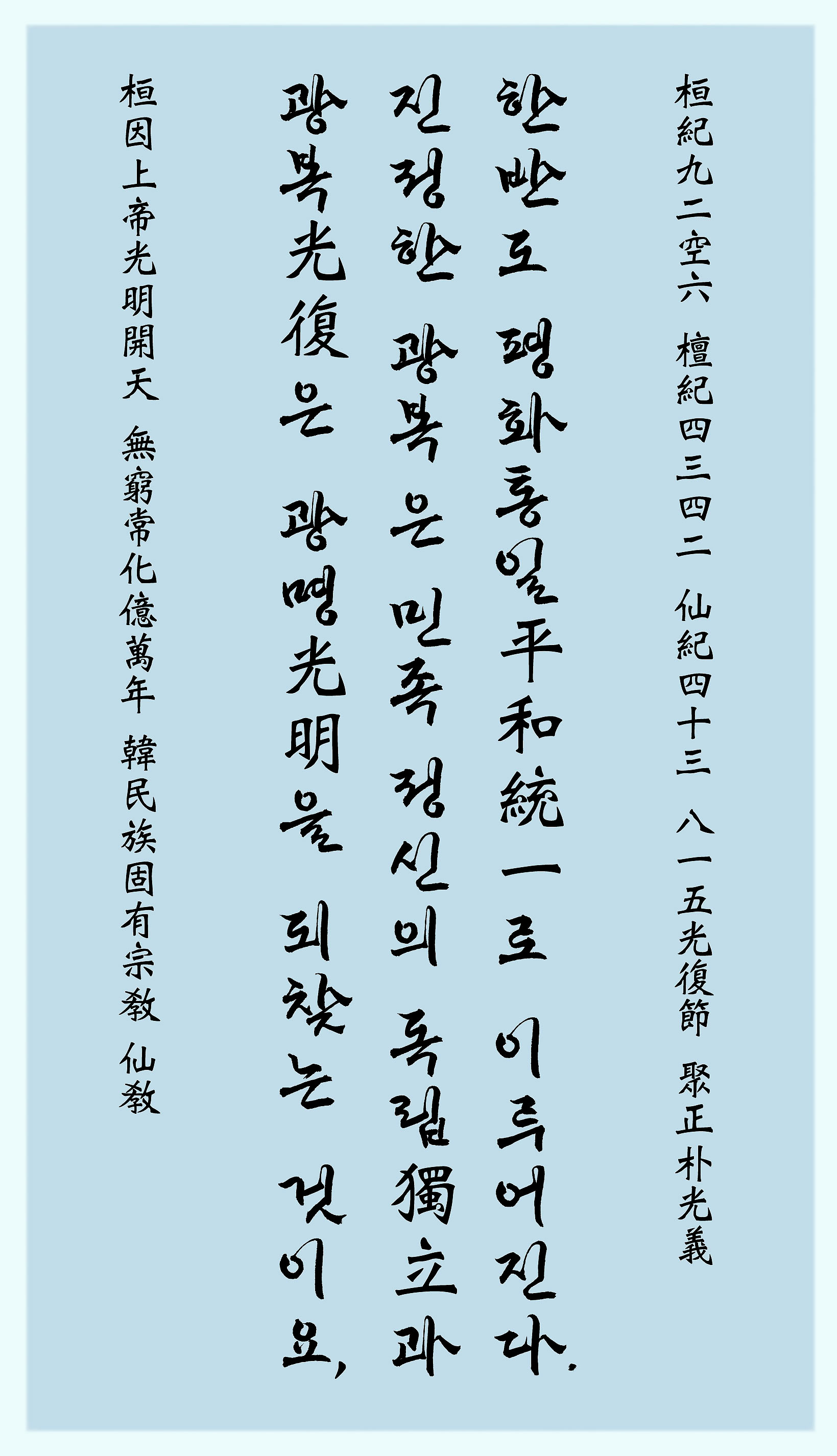 『 큰 밝음의 나라 대광명국(大光明國) 대한민국(大韓民國), 오늘 우리 대한은 ‘80주년 광복절(光復節)’을 맞이하였습니다. 올해 환기9222년 단기4358년 선기59년 2025년은 삼일만세운동 106주년이며 광복절 제80주년의 해입니다. ○ 삼일만세운동과 임시정부수립, 광복(光復)은 주권을 회복하고자 하는 민족의 하나된 염원이며 그 뿌리는 한민족의 광명사상(光明思想)입니다. ○ 우리 한민족의 광명사상(光明思想)은 일제강점기의 암흑을 뚫고 ‘대한독립만세’의 뜨거운 함성으로 터져나와 임시정부수립으로 이어져 마침내, 내 나라와 겨레의 빛을 되찾는 ‘광복(光復)의 날’을 맞이하게 되었습니다. ○ 대한(大韓)의 광복(光復) 80주년을 맞이한 오늘, 우리는 ‘진정한 광복과 완전한 독립’에 대하여 다시 한번 생각해야 합니다. ○ 광복(光復)이란 빛(光)을 되찾음(復)이요, 주권을 회복했다는 뜻입니다. 광복절이란 한반도가 일본으로부터 해방되어 주권을 되찾았음을 기념하는 날이지만, 해방직후 대한제국은 미국과 소련의 군정에 의해 대한민국과 조선민주주의 인민공화국으로 나뉘었고, 현재는 남북이 분단된 채 광복을 기리고 있습니다. 따라서 민족정신 부활과 자주국방으로 한반도 평화통일을 이루어야만 비로소 우리 대한은 진정한 광복을 이루게 되는 것입니다. ○ ‘완전한 독립(獨立)’은 자주국방과 자립경제를 의미하며 더 나아가 민족정신의 부활과 종교적 독립을 포함합니니다. 종교(宗敎)란 근본 종(宗)에 가르칠 교(敎)로서, 가장 근본이 되는 가르침이라는 뜻입니다. 종가(宗家)나 종손(宗孫)이 한 가문의 혈통을 상징하고 있듯이, 한 나라의 종교(宗敎)는 대대로 전하는 그 나라의 족보와 같은 것입니니. ○ 세계의 모든 종교는 저마다의 민족종교(民族宗敎)에서 출발하였으며 민족종교의 본질은 해당 민족의 번영을 염원하는 것인바, 외래종교가 아닌 우리 한민족의 고유종교로써 정신적 독립을 이룰 때, 비로소 우리나라는 자주국방 자립경제에 근간한 완전한 대한독립과 민족중흥을 실현할 수 있는 것입니다. ○ 진정한 광복 완전한 독립은 남북분단 상황이 종결되어 한반도 평화통일을 이루는 것이며, 이러한 민족통일은 민족정신의 벼리가 되어 온 민족종교로써 이루어낼 수 있는 것입니다. ○ 선교(仙敎)는 한민족의 고유한 민족종교이자 하늘의 교화 천교(天敎)입니다. 선교(仙敎)는 우리 한민족의 시원과 한민족의 하느님 환인상제(因桓上帝)의 교화, 즉 한민족의 족보를 가르치고 배우는 한민족 고유종교이며, 하늘이 스스로 사람을 교화하고자 내리신 근본적인 가르침인 것입니다. ○ 그러하기에 선교의 교리는 한민족의 이익과 번영에 그치지 않고 온 세상 모두가 평등하고 공평하며 조화로운 대동세계, 만민평등 만사공평 만물화평의 대동개천 한울세상을 지향합니다. ○ 환인(桓因) 하느님께서 사백력지천(斯白力之天)에서 홀로 신으로 화하시어 우주천지 생무생일체를 창조하시고 교화하시니 한민족은 최초의 인류, 인류의 시원족으로 이 땅에 생겨났습니다. ○ 우리 민족은 빛의 민족(桓族,환족)이며 인류의 시원민족(始源民族)이고, 우리나라는 빛의 나라(大光明桓國,대광명환국)이며, 온 인류를 빛(光明)으로 교화(敎化)하는 광명이세 · 홍익인간 · 재세이화(光明以世 弘益人間 在世理化)의 나라입니다. ○ 환인(桓因) 하느님의 사백력광명개천(斯白力光明開天)은 우리 한민족(韓民族,桓族)의 창세기이며, 한민족 최초의 나라 환국(桓國)과 환웅의 신시배달국(神市倍達國), 단군의 고조선(古朝鮮) 아사달(阿斯達), 대한민국(大韓民國)에 이르기까지 한민족의 국호는 큰 밝음의 나라 대광명국(大光明國)을 의미합니다. ○ 한민족의 시조 환인(桓因) 하느님께서 이 나라 대한의 만백성에게 부여하신 ‘광명(光明)’은 ‘신성(神性)의 빛’입니다. 그러므로 대한의 광복(光復)은 신성(神性)의 회복(回復)이며, 온 인류를 신성의 빛으로 교화하여 대광명(大光明)으로 인도하는 광명이세(光明理世) 홍익인간(弘益人間) 재세이화(在世理化)의 실제인 것입니다 ... (이하생략) 』