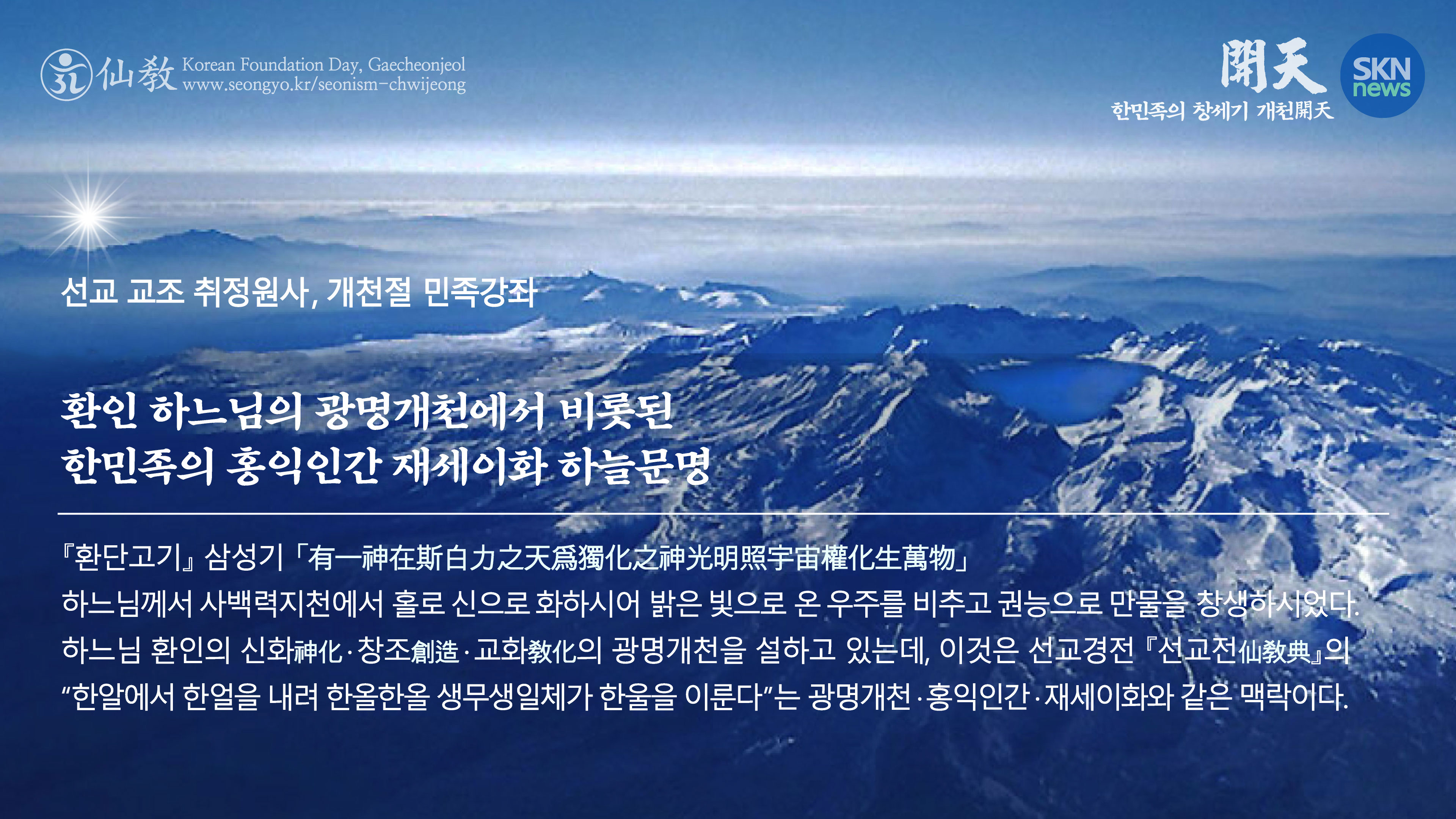 “선교경전 『선교전(仙敎典)』에서 이르기를 ‘한알에서 한얼이 내려 한올한올 생무생일체가 한울을 이룬다’ 하였다. ○ 한알이신 환인(桓因)께서 사백력(斯白力)의 하늘에서 홀로 신으로 화하시어(獨化之神), 사백력지천(斯白力之天) 태초(太初)의 빛(光明)으로 우주천지를 창조하시고, 생무생일체(生無生一切)에 한얼을 내리시어 빛의 망라(網羅) 율려(律呂)의 그물 한올한올이 상생조화하여 한울을 이루게 하시니, 이것이 ‘한민족(韓民族)의 창세기(創世記) 광명개천(光明開天)’이다. ○ 인류의 시원민족(始原民族)인 우리 한민족(韓民族)은 환인(桓因) 하느님의 사백력지천(斯白力之天) 광명개천(光明開天)에 연원한 빛의 문명인 ‘하늘문명’으로 태동하였다. ○ 한민족(韓民族)은 환인(桓因) 하느님의 광명개천(光明開天) 창세(創世)를 기리고자 이후, 나라를 세우는 개국(開國)을 개천(開天)이라 불렀으니, 환인(桓仁)의 환국개천(桓國開天), 환웅(桓雄)의 신시개천(神市開天), 단군(檀君)의 소도개천(蘇塗開天)으로 이어지는 한민족 개천의 역사(韓民族開天史)가 그것이다. ○ 한민족은 나라를 열 때마다 하느님 환인(桓因)의 광명개천(光明開天)을 본받고자 하였으니, 이것이 우리 한민족 고유의 광명사상(光明思想)이며, 한민족의 광명사상은 최초의 나라 환국(桓國)과 환웅의 신시배달국(神市倍達國), 단군의 고조선(古朝鮮) 아사달(阿斯達), 대한민국(大韓民國)에 이르기까지 큰 밝음의 나라 대광명국(大光明國)을 의미하는 한민족의 국호(國號)로 상징된다. ○ 따라서 우리 민족의 태동은 곧 한민족의 창세기인 하느님 환인(天帝桓因)의 광명개천(光明開天)에 기원하는 것이요, 우리 한민족은 ‘하늘민족’이며, 한민족의 문명은 ‘하늘문명’임을 상기하고 자손만대에 전하여, 창세(創世)의 기원인 개천(開天)을 기려야 하는 것이다. ○ 개천절(開天節)은 음력 10월 3일 환인(桓因) 하느님의 광명개천(光明開天)을 기리는 제천의식(祭天儀式)으로 봉행해야 한다. ○ 현재 얌력 10월 3일 개천절(開天節)의 백과사전적 의미는 단군(檀君)의 고조선(古朝鮮) 건국(建國)을 기리는 날로 되어있으나, 개천절(開天節)은 마땅히 환인(桓因) 하느님의 창세기 개천(開天)을 기리는 날로 바뀌어야 하며, 날짜 역시 본래의 개천절인 음력 10월 3일에 환인(桓因) 하느님을 향한 제천의례로 진행해야 올바른 것이다. ○ 또한, 하늘민족인 한민족의 기원이 환인(桓因) 하느님의 광명개천(光明開天)에 있음을 깨달아 나라의 연호(年號) 역시 환국기원(桓國紀元) ‘환기(桓紀)’로 바꾸어야 한다. ○ 자주국(自主國)일 때는 독자적 연호를 쓰고 식민지(植民地)일 때는 타국의 연호를 사용했던 역사를 상기해 볼 때, 한민족이 기독교국의 연호인 서기(西紀)를 사용하는 것은 옳지 않다. 우리 한민족 고유의 연호(韓民族固有年號)인 ‘환기(桓紀)’를 사용해야만 우리나라와 민족의 자주의식을 회복하고 잃어버린 한국의 상고사를 되찾게 되는 것이다. ○ ‘우리 한민족의 뿌리’가 한민족의 시조이시며 온 세상의 하느님이신 ‘환인(桓因)’의 사백력지천(斯白力之天) 광명개천(光明開天)에서 비롯된 ‘하늘문명’에 있으며, 한민족이 곧 하늘민족임을 깨달을 때 비로소 자신에게 잠재된 하늘의 성품, 하느님의 씨앗 ‘신성(神性)’을 회복하여 진리의 근원으로 바르게 정회(正回)하게 되느니, 나아가 한민족은 창세기 개천(開天)의 숭고한 역사를 되찾아, 환인 하느님의 향훈 아래 온 인류를 신성회복(神性回復)의 길로 이끌어야 한다. ○ 하느님 환인(桓因)의 자손인 우리는 빛의 광명교화(光明敎化)를 널리 펼치어, 광명이세(光明理世) 홍익인간(弘益人間) 재세이화(在世理化)의 선교사명을 완수해야 하는 것이다. ○ 이것이 개천(開天)이라는 창세(創世)의 역사를 가진 하늘민족의 사명이요, 하늘과 땅 사람이 개천(開天) · 개지(開地) · 개인(開人)하여 이루는 천지인 대동개천(天地人大同開天) 한울세상을 실현하는 길이다.”