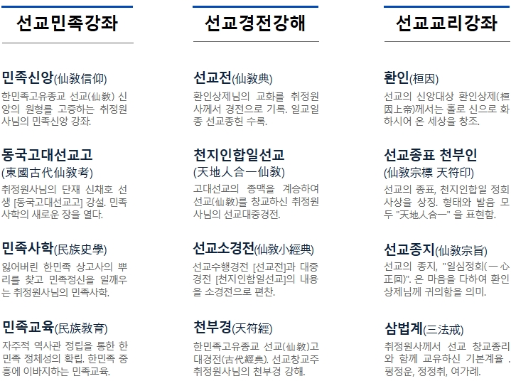 선교 교단을 대표하는 재단법인 선교(仙敎)는 선교 창시자 취정원사께서 창교하신 한민족 고유종교 선교(仙敎)에 대한 이해와 포덕교화를 위해 재단법인 선교 산하 선교총림 선림원의 주관으로 선교학당 교리강좌를 실시하여, 선교강원(仙敎講院)의 교무(敎務)를 양성하고 선교 교리 연구 활동과 선교경전과 교리 보전에 힘씁니다.