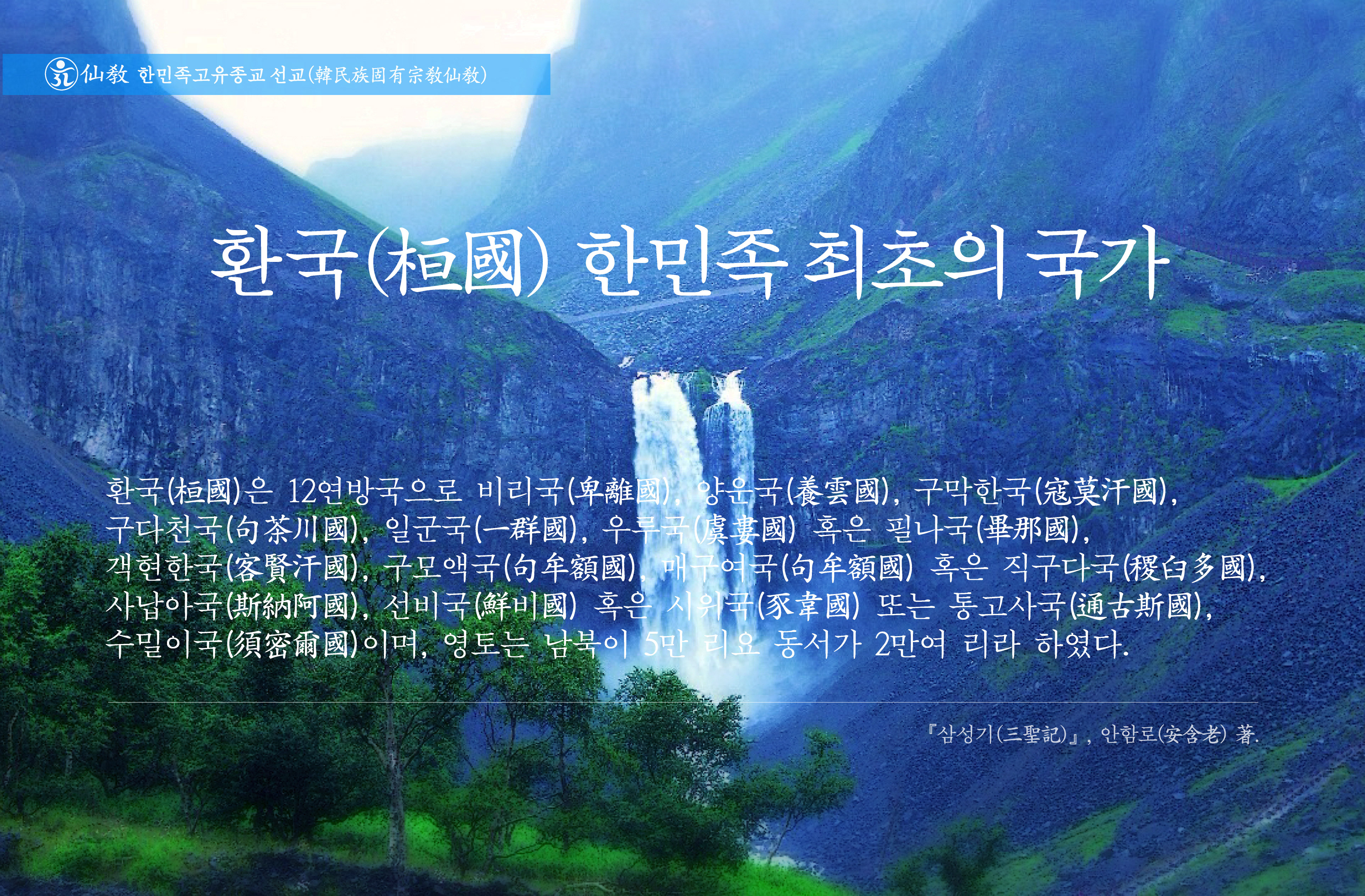 “환국(桓國)은 환인(桓仁)이 세운 한민족 최초의 국가이다. 『환단고기 삼성기』는 환국의 역사에 대하여 자세히 기술하고 있으니, 안파견(安巴堅) 환인에서 비롯하여 혁서(赫胥) 환인, 고시리(古是利) 환인, 주우양(朱于襄) 환인, 석제임(釋帝壬) 환인, 구을리(邱乙利) 환인, 지위리(智爲利) 환인까지 7세, 3,301년을 전하였다 하였으며, 환국(桓國)은 12연방국으로 비리국(卑離國), 양운국(養雲國), 구막한국(寇莫汗國), 구다천국(句茶川國), 일군국(一群國), 우루국(虞婁國) 혹은 필나국(畢那國), 객현한국(客賢汗國), 구모액국(句牟額國), 매구여국(句牟額國) 혹은 직구다국(稷臼多國), 사납아국(斯納阿國), 선비국(鮮비國) 혹은 시위국(豕韋國) 또는 통고사국(通古斯國), 수밀이국(須密爾國)이며, 영토는 남북이 5만 리요 동서가 2만여 리라 하였다.” _ 《삼성기(三聖記)》 안함로 著.