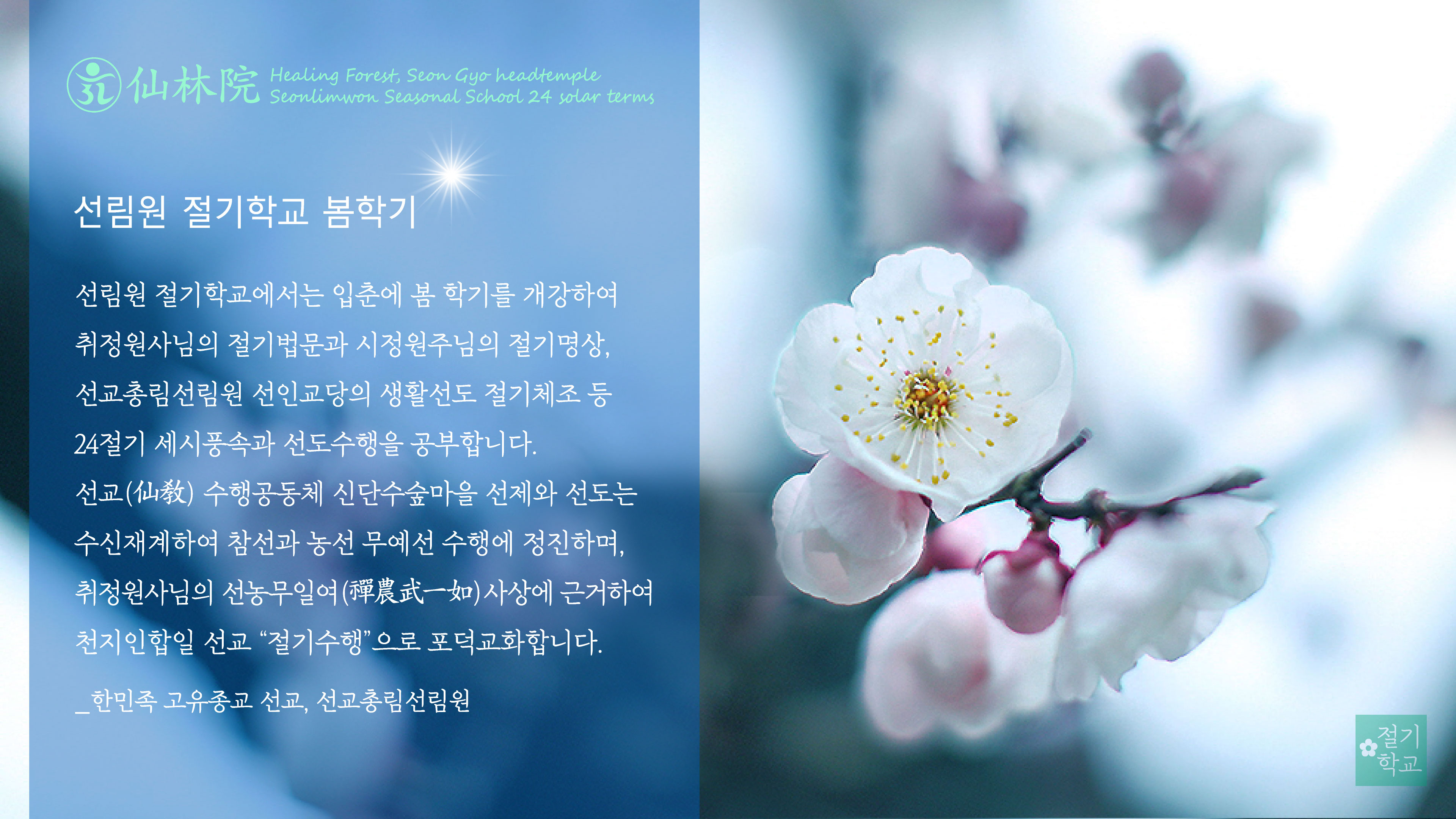 선교 교단의 음력 2월 선정 기간에 들어, 온 인류 신성회복의 길을 여는 정화기도에 정진하는 가운데, 선교총림 선림원을 설립한 시정원주님은 우수(雨水) 절기명상과 절기체조 소생진(蘇生振)을 공개시연하고, 절기 강연에서 “한국(韓國)은 태양의 황도에 따른 4계절 24절기가 가장 뚜렷한 천혜의 ‘하늘문명국’이며 한국의 고유한 세시풍속과 절기문화가 인류를 구원하는 신성회복(神性回復)의 길을 열게 될 것”이라는 내용으로 설법하셨습니다.