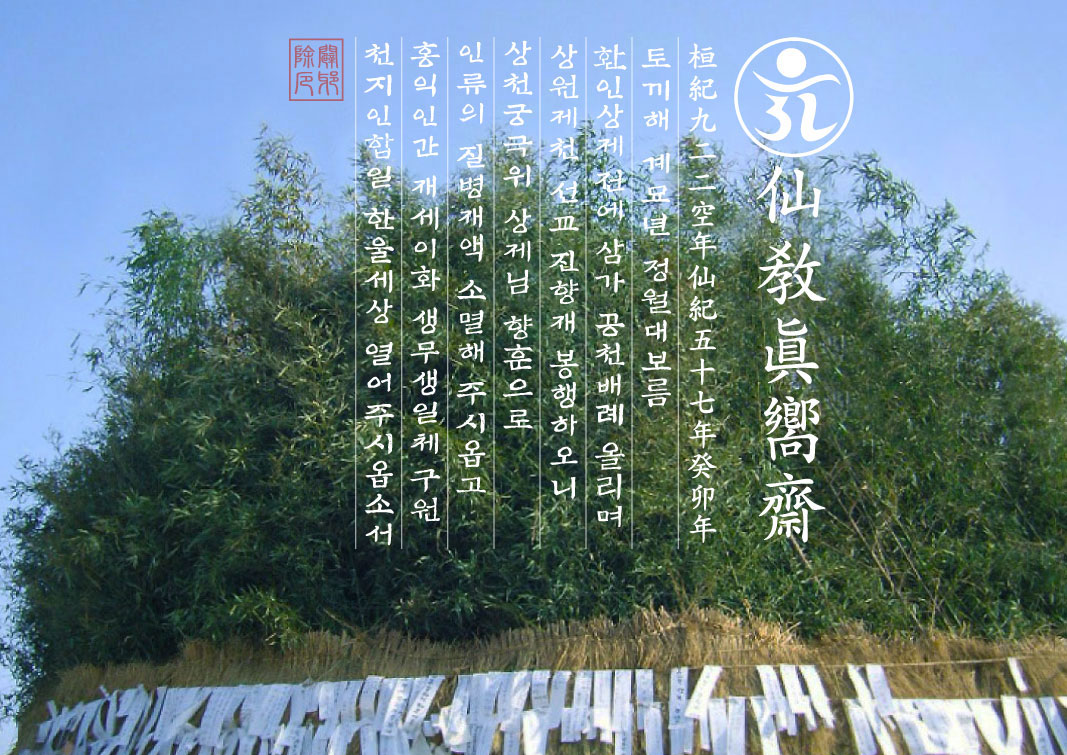 ※ [仙敎典] : 선교경전. 선교 교조 박광의(朴光義) 취정원사(聚正元師) 源著. 취정워사께서 1988년 환인상제로부터 개천입교(開天立敎)의 천명을 받아 1991년 1차 결집, 1997년 2차 결집된 선교경전. 선교 교단에서는 [선교전(仙敎典)]을 고유경전으로, [천지인합일선교(天地人合一仙敎)]를 대중경전으로 보전한다.