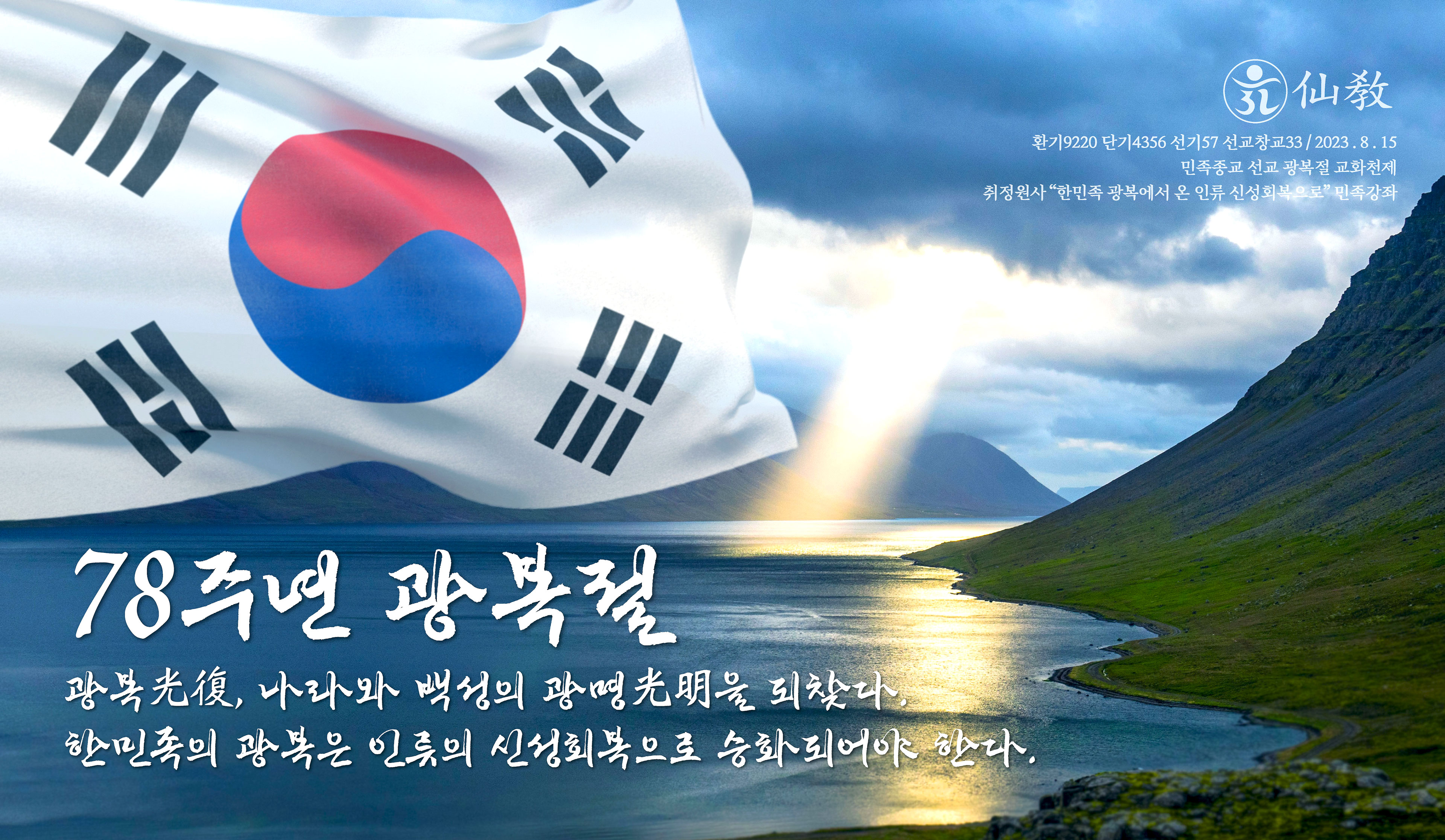 “78번째 광복절(光復節)을 맞은 오늘, 한민족의 광복(光復)은 주권회복(主權回復)의 의미에서 신성회복(神性回復)의 의미로 승화되어야 함을 생각합니다. ‘광복(光復)’은 우리나라의 주권을 되찾은 것이요, 나라의 주인인 만백성이 생명을 회복한 것입니다. 한민족의 생명(生命)은 하느님의 빛 광명(光明)에 있는 것이기에, 대한 조선(大韓朝鮮)의 광복(光復)은 생명의 빛을 되찾은 것이요, 하늘의 광명(光明)이 이 땅에 다시 빛나게 된 것입니다. 다시말하여 광복(光復)은 광명(光明)을 회복한 것입니다. 한민족은 하늘민족이요, 한민족의 나라 대한(大韓), 조선(朝鮮)의 주권(主權)은 하느님이 이 나라 만백성에게 부여하신 ‘광명(光明)’이요, 절대적인 ‘신성(神性)의 빛’ 입니다.”