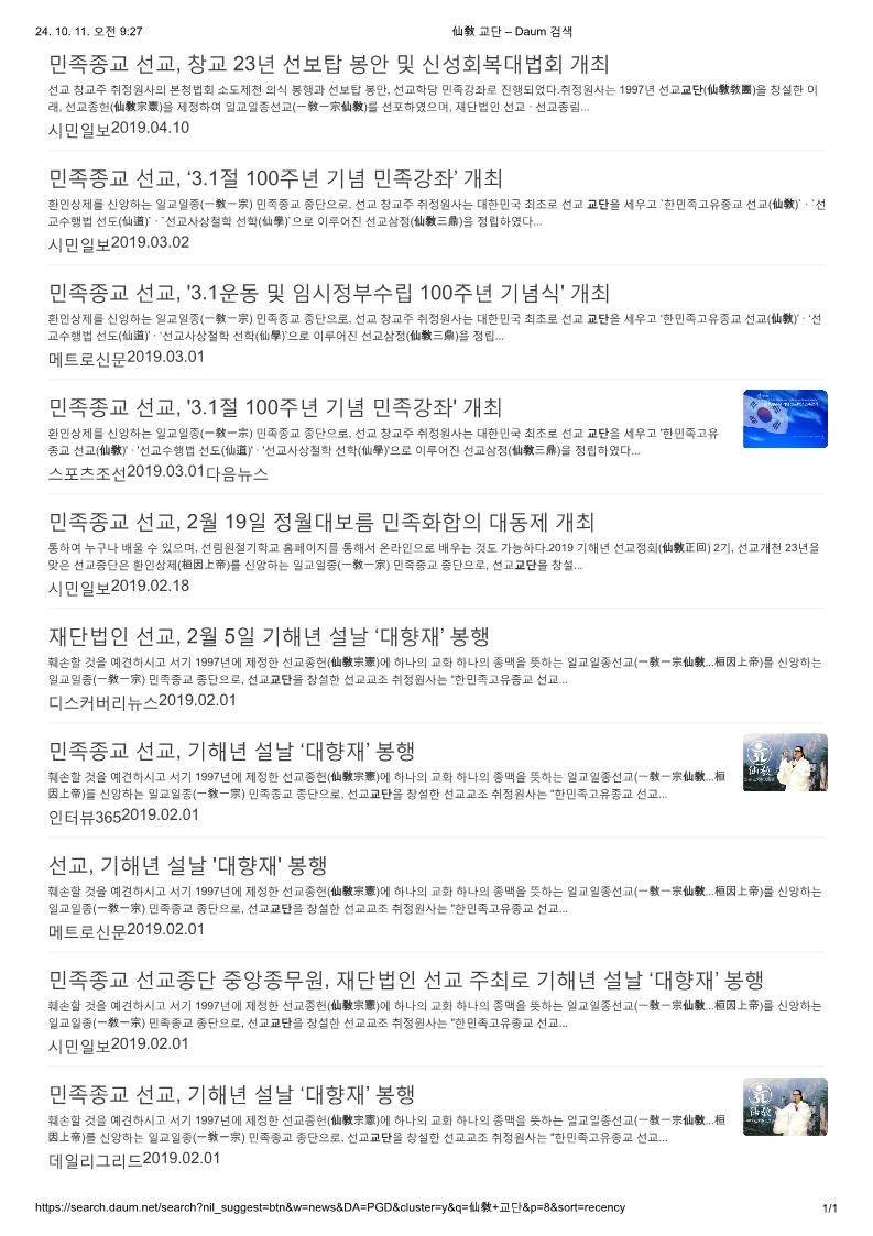 *다음(Daum) 뉴스를 중심으로 확인된 “선교(仙敎) 교단” 종사(宗史) _ (2024.10.11 기준)
