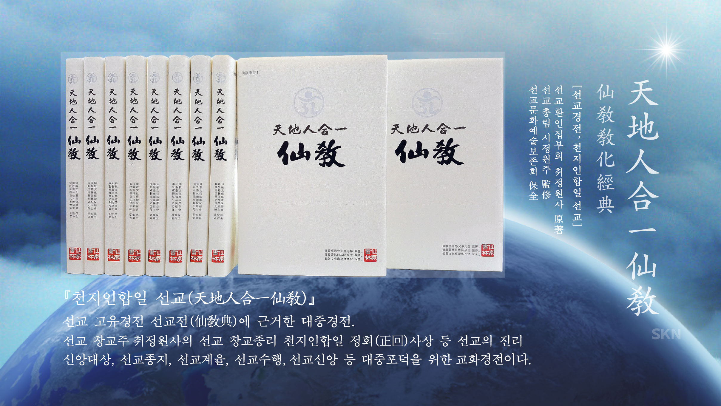 천지인합일(天地人合一)의 종교 선교(仙敎) · 선교수행 선도(仙道) · 선교철학 선학(仙學)으로 대표되는 선(仙)문화의 중흥시대는 우주천지만물과 모든 교도리학(敎道理學)이 선교삼정으로 회귀하여, 선(仙)의 본원이며 진리(眞理)의 근원이신 하느님 환인(桓因)께 귀의(歸依)하여 일심정회(一心正回)하게 되는 천도순리(天道順理)가 이 땅에 펼쳐지는 재세이화 한울세상 실현의 교두보가 될 것이다. 선교(仙敎)를 신앙하고, 선도(仙道)를 닦으며, 선학(仙學)을 배우고 익히는 선교삼정(仙敎三鼎)의 실천에 정진하라 선제들이여! 」