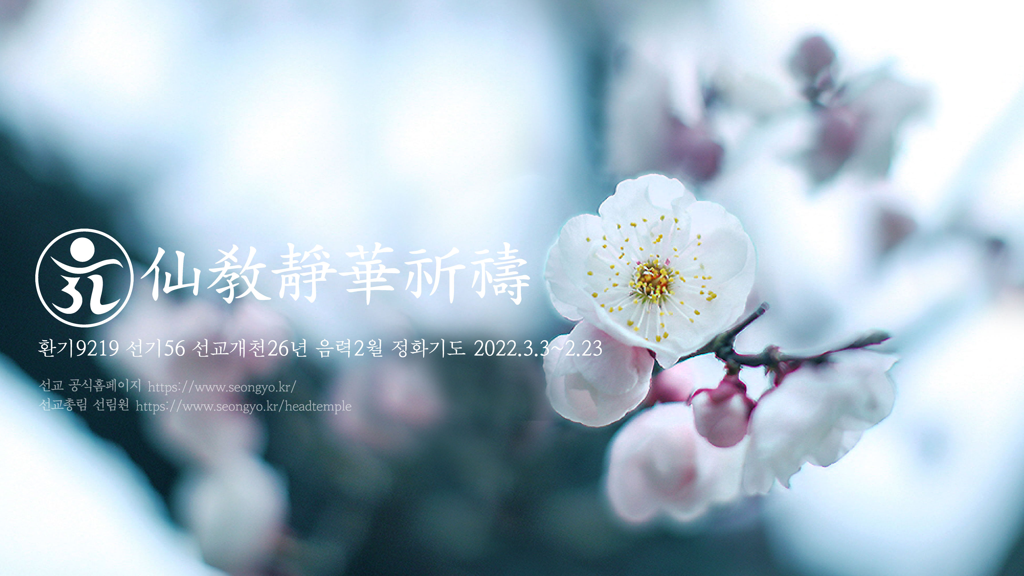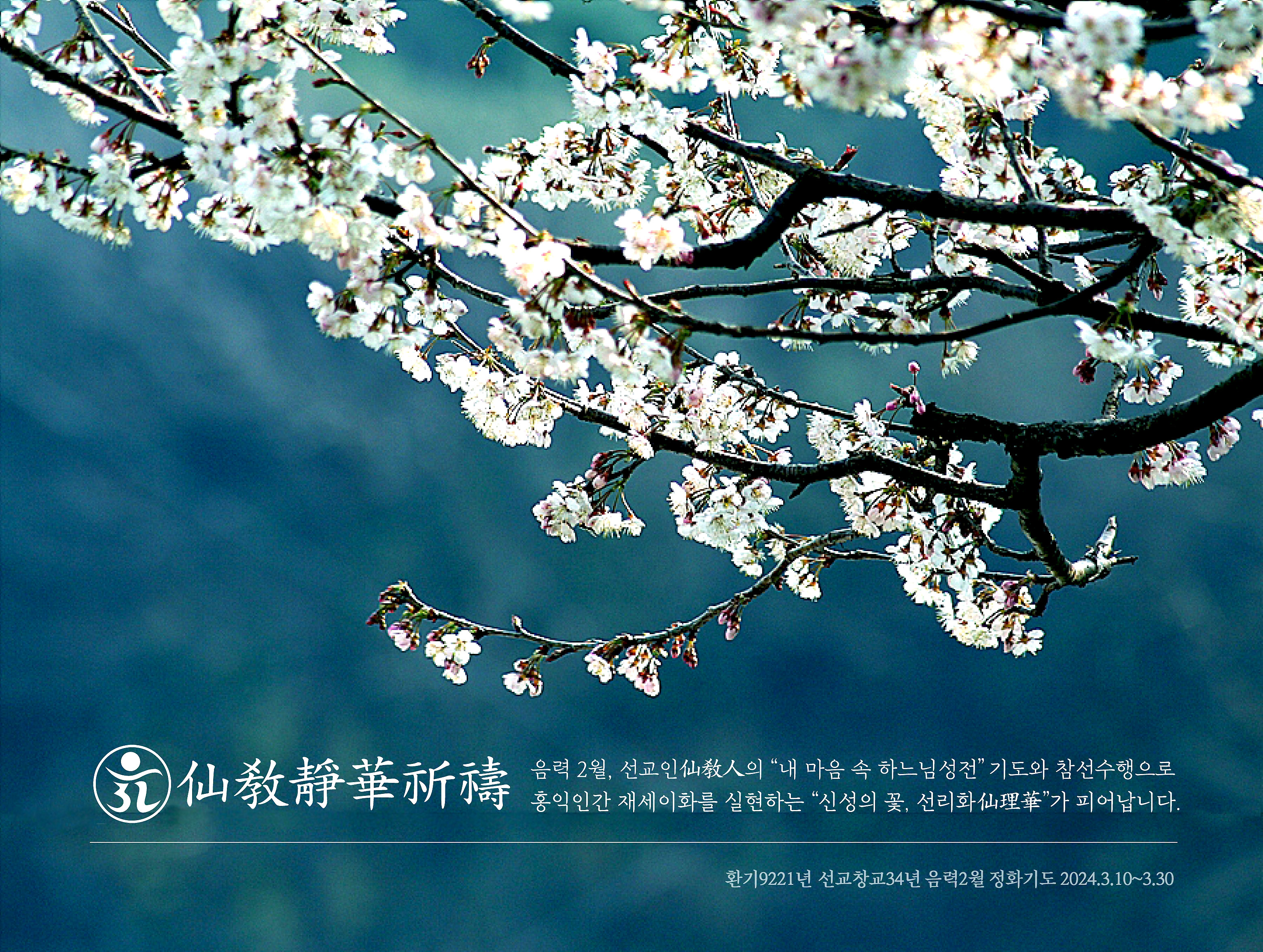 한민족 고유종교 선교 / 선교의례 도성 / 음력 2월 삼칠일선정 환기9221년 선기58년 선교개천입교37년 선교창교34년 갑진년“신성의 꽃 선리화(仙理華)”를 꽃피우는 한민족 고유종교 선교(仙敎)의 음력2월선정 _홍익인간 재세이화를 실현하는 선교인의 기도 선정과 참선 수행 _ 선교총림 음력2월 선정 仙敎叢林陰曆二月禪靜韓民族固有宗敎仙敎桓紀九二二一年仙紀五十八年仙敎開天立敎三十七年甲辰年 陰曆二月仙敎叢林仙林院靜華祈禱三七日禪靜 민족종교 선교총본산 / 선교총림선림원 2024년 음력 2월 삼칠일 정화기도 안내 _ ※ 기간 : 2024.3.10.월(음2.1) ~ 2024.3.30.수(음2.21)※ 입재 : 2024.3.10 오전 10시 / 회향 : 2024.3.30 오전 10시※ 2024년 음력 2월 정화기도..